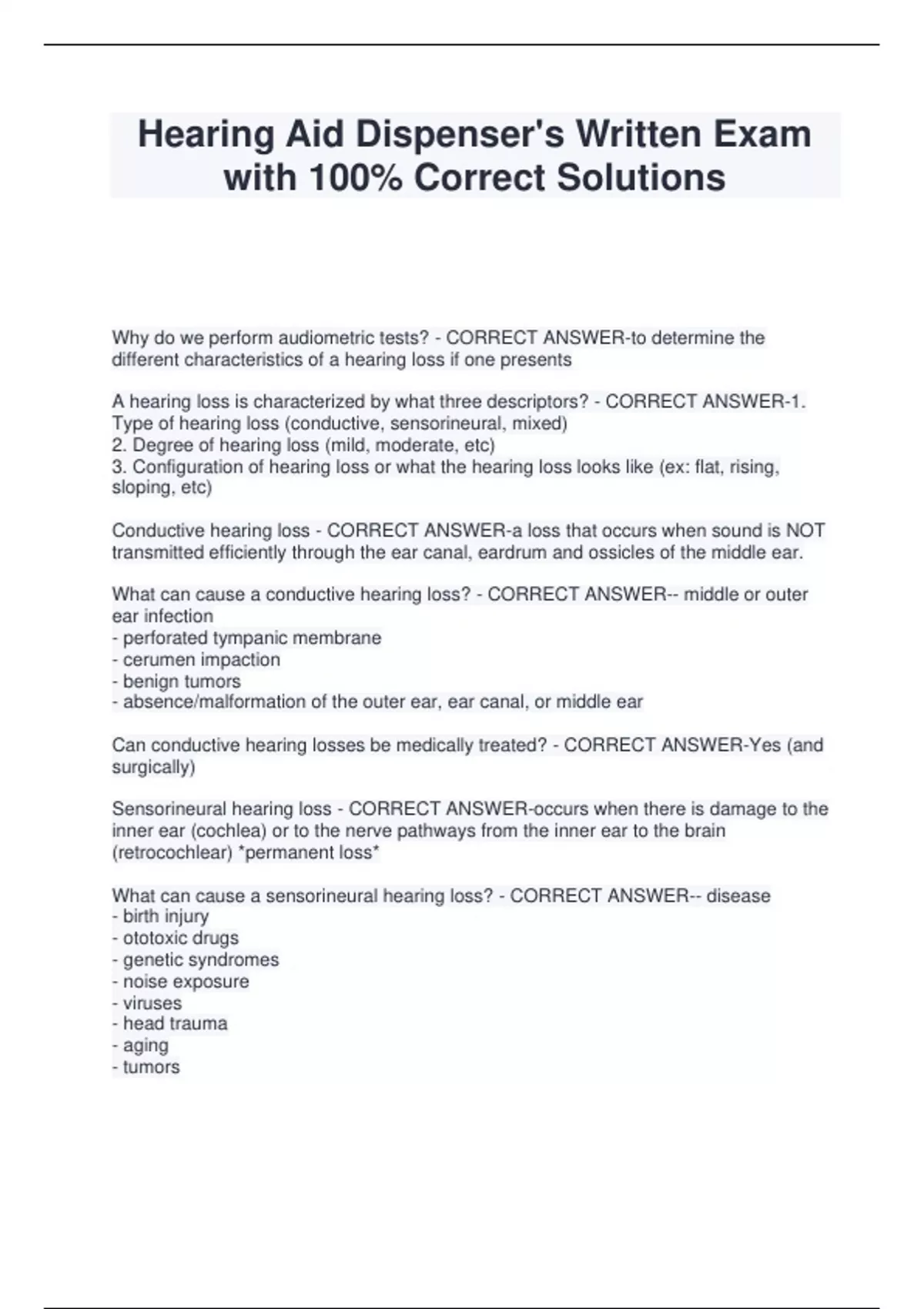 Hearing Aid Dispenser's Written Exam with 100% Correct Solutions Why do we perform audiometric tests? - CORRECT ANSWER-to determine the different characteristics of a hearing loss if one presents A hearing loss is characterized by what three descriptors? - CORRECT ANSWER-1. Type of hearing loss (conductive, sensorineural, mixed) 2. Degree of hearing loss (mild, moderate, etc) 3. Configuration of hearing loss or what the hearing loss looks like (ex: flat, rising, sloping, etc) Conductive hearing loss - CORRECT ANSWER-a loss that occurs when sound is NOT transmitted efficiently through the ear canal, eardrum and ossicles of the middle ear. What can cause a conductive hearing loss? - CORRECT ANSWER-- middle or outer ear infection - perforated tympanic membrane - cerumen impaction - benign tumors - absence/malformation of the outer ear, ear canal, or middle ear Can conductive hearing losses be medically treated? - CORRECT ANSWER-Yes (and surgically) Sensorineural hearing loss - CORRECT ANSWER-occurs when there is damage to the inner ear (cochlea) or to the nerve pathways from the inner ear to the brain (retrocochlear) *permanent loss* What can cause a sensorineural hearing loss? - CORRECT ANSWER-- disease - birth injury - ototoxic drugs - genetic syndromes - noise exposure - viruses - head trauma - aging - tumors Can sensorineural hearing loss be medically or surgically corrected? - CORRECT ANSWER-No Mixed hearing loss - CORRECT ANSWER-occurs when there is damage to the outer and inner ear (cochlea) or auditory nerve * air-bone gap with abnormal air and bone conduction thresholds* Degree of hearing loss - CORRECT ANSWER-Normal: -10-25 Mild: 26-40 Moderate: 41-55 Moderately-severe: 56-70 Severe: 71-90 Profound: 91 + * pediatric normal: -10-15, slight: 16-25* The configuration (or shape) of the hearing loss refers to what? - CORRECT ANSWER1. extent of hearing loss at each frequency 2. overall picture of hearing that is created What are some configurations of hearing loss? - CORRECT ANSWER-- flat: generally varies within 10-15 dB at all frequencies - gently sloping: a gradual reduction from lower to higher frequencies - rising or reverse slope: greater hearing loss in the low frequencies, better hearing in the high frequencies - precipitous slope: (ski slope or high frequency) better hearing in the low frequency range to a severe drop in the high frequency range Noise-notch hearing loss - CORRECT ANSWER-- common with people that have had a history of noise exposure - noise notch between 3000 and 6000 Hz Unilateral hearing loss - CORRECT ANSWER-loss of hearing in one ear only Bilateral hearing loss - CORRECT ANSWER-loss of hearing in both ears Fluctuating hearing loss - CORRECT ANSWER-hearing loss that is always changing over time Stable hearing loss - CORRECT ANSWER-no change in hearing over time Sudden hearing loss - CORRECT ANSWER-loss of hearing that occurs quickly Progressive hearing loss - CORRECT ANSWER-loss of hearing that presents slowly over tim