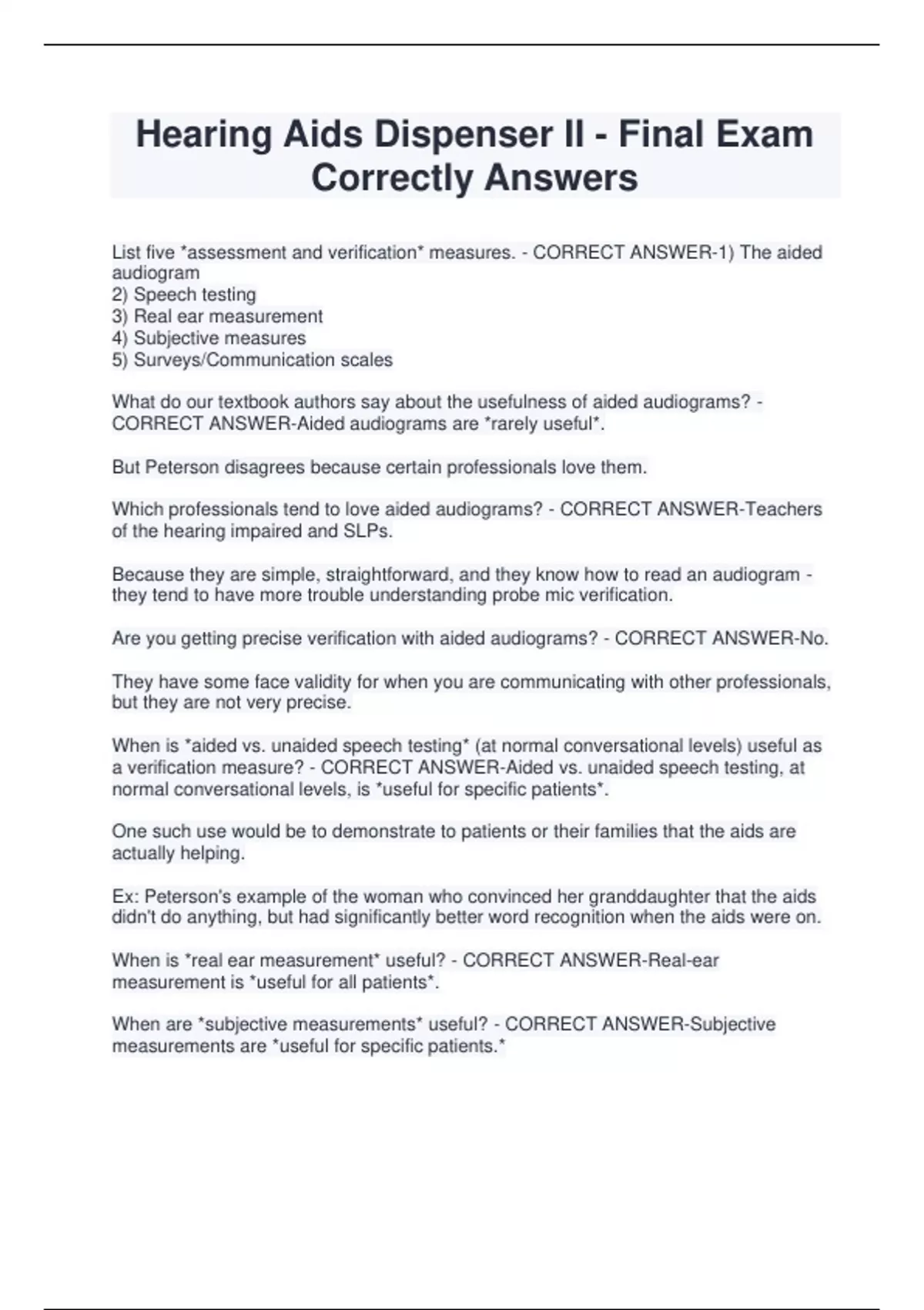 Hearing Aids Dispenser II - Final Exam Correctly Answers List five *assessment and verification* measures. - CORRECT ANSWER-1) The aided audiogram 2) Speech testing 3) Real ear measurement 4) Subjective measures 5) Surveys/Communication scales What do our textbook authors say about the usefulness of aided audiograms? - CORRECT ANSWER-Aided audiograms are *rarely useful*. But Peterson disagrees because certain professionals love them. Which professionals tend to love aided audiograms? - CORRECT ANSWER-Teachers of the hearing impaired and SLPs. Because they are simple, straightforward, and they know how to read an audiogram - they tend to have more trouble understanding probe mic verification. Are you getting precise verification with aided audiograms? - CORRECT ANSWER-No. They have some face validity for when you are communicating with other professionals, but they are not very precise. When is *aided vs. unaided speech testing* (at normal conversational levels) useful as a verification measure? - CORRECT ANSWER-Aided vs. unaided speech testing, at normal conversational levels, is *useful for specific patients*. One such use would be to demonstrate to patients or their families that the aids are actually helping. Ex: Peterson's example of the woman who convinced her granddaughter that the aids didn't do anything, but had significantly better word recognition when the aids were on. When is *real ear measurement* useful? - CORRECT ANSWER-Real-ear measurement is *useful for all patients*. When are *subjective measurements* useful? - CORRECT ANSWER-Subjective measurements are *useful for specific patients.* When are *surveys/communication scales* useful? - CORRECT ANSWERSurveys/communication scales are *useful for most patients*. What did a recent study determine regarding the benefit of conducting surveys? - CORRECT ANSWER-The study found that *regardless of what questions you ask*, simply *sending out a survey increased satisfaction by 15-20%.* What was the aided audiogram called historically? - CORRECT ANSWER-Functional gain measure How do you obtain an aided audiogram? - CORRECT ANSWER---Patient goes into the sound booth, *puts the hearing aids on* and sits *one meter from the speaker* --Patient raises his/her hand in response to *warble tones* and you get an aided threshold (A) --Can compare the aided threshold to ear-specific thresholds or do an unaided soundfield test for a true comparison (so it would compare S vs. A) If a patient's aided soundfield threshold (A) was 30 dB better than their unaided soundfield threshold (S) at 1000 Hz, how would you describe that improvement? - CORRECT ANSWER-They have 30 dB *functional gain* at 1000 Hz. What are four reasons why the aided audiogram rarely useful? - CORRECT ANSWER1) Fewer data points because we have *only FIVE measurement points for frequency* (while probe mic has maybe 1005) 2) *Uses 5 dB increments* so it is *LESS PRECISE in terms of intensity* 3) *Tells us NOTHING about CONVERSATIONAL SPEECH and LOUD inputs* - only gives us data about the *maximum gain benefit* at *soft inputs* because it is a *threshold* test - creates a false sense of gain amount 4) *Test is SUBJECTIVE* because we rely on a behavioral response Summarize the limitations of the aided audiogram. - CORRECT ANSWER-1) Restricted data points in terms of *FREQUENCY* (because only 5 frequencies measured) 2) Restricted data points in terms of *INTENSITY* (because 5 dB increments) 3) Only measures *gain for SOFT inputs* 4) Uses a *SUBJECTIVE response* Summarize the five *assessment and verification measures* and the *usefulness* of each. - CORRECT ANSWER-1) Aided audiogram - Rarely useful 2) Speech testing - Useful for specific patients 3) Real ear measure