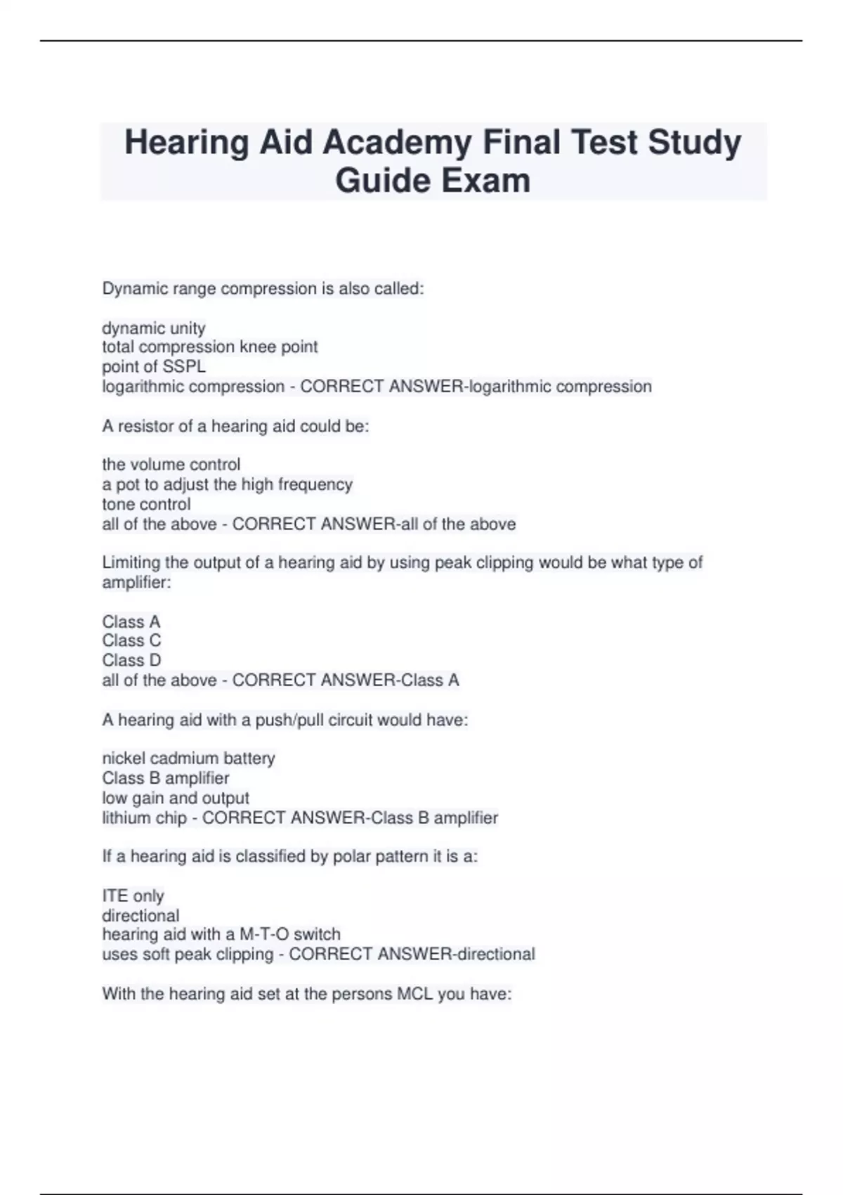 Hearing Aid Academy Final Test Study Guide Exam Dynamic range compression is also called: dynamic unity total compression knee point point of SSPL logarithmic compression - CORRECT ANSWER-logarithmic compression A resistor of a hearing aid could be: the volume control a pot to adjust the high frequency tone control all of the above - CORRECT ANSWER-all of the above Limiting the output of a hearing aid by using peak clipping would be what type of amplifier: Class A Class C Class D all of the above - CORRECT ANSWER-Class A A hearing aid with a push/pull circuit would have: nickel cadmium battery Class B amplifier low gain and output lithium chip - CORRECT ANSWER-Class B amplifier If a hearing aid is classified by polar pattern it is a: ITE only directional hearing aid with a M-T-O switch uses soft peak clipping - CORRECT ANSWER-directional With the hearing aid set at the persons MCL you have: usable gain greater DR range functional gain usable threshold gain - CORRECT ANSWER-functional gain Prescription formulas are based on which of the following: Pogo method Berger method NAL method comparative methods - CORRECT ANSWER-comparative methods Which of the following reasons would you likely fit a bone conduction hearing aid: cost bilateral atresia more gain bilateral sensorineural hearing loss - CORRECT ANSWER-bilateral atresia Sound field are free field are used to: verify the fit of a hearing instrument give you aided and unaided scores to do sound tests using speaker and not head sets all of the above - CORRECT ANSWER-all of the above When doing sound field and free field the speaker should be: 45 degrees azimuth and 1 meter 0 degrees azimuth and 1 meter 90 degrees azimuth and 2 meters 180 degrees azimuth and 2 meters - CORRECT ANSWER-0 degrees azimuth and 1 meter Showing the difference between REAR and REUR you would have: insertion gain insertion loss only for 3 KHz insertion response for the 2 cc coupler insertion flat results - CORRECT ANSWER-insertion gain If a persons hearing aid showed a Matrix of 107/35/20 it would give their: MCL UCL SPL, gain and tone SSPL, gain and slope - CORRECT ANSWER-SSPL, gain and slope Which of the following is a term for closure of the external auditory canal: