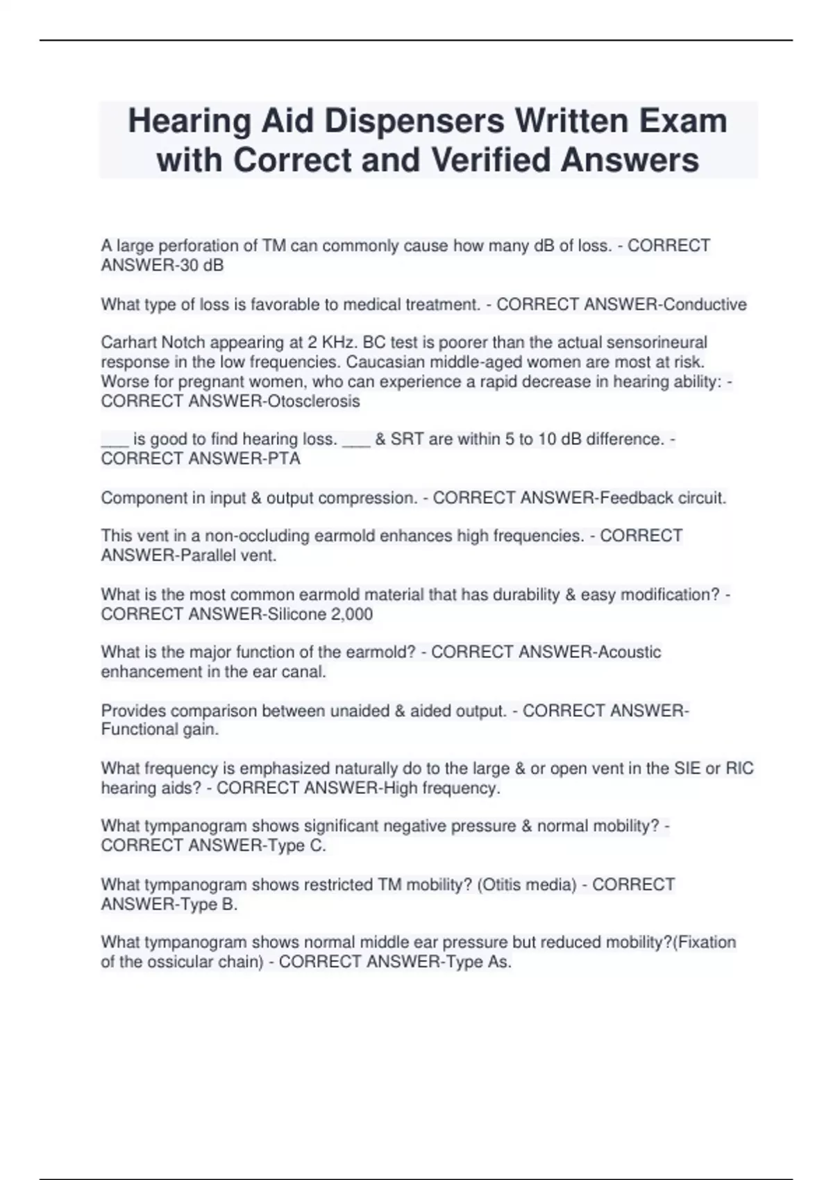 Hearing Aid Dispensers Written Exam with Correct and Verified Answers A large perforation of TM can commonly cause how many dB of loss. - CORRECT ANSWER-30 dB What type of loss is favorable to medical treatment. - CORRECT ANSWER-Conductive Carhart Notch appearing at 2 KHz. BC test is poorer than the actual sensorineural response in the low frequencies. Caucasian middle-aged women are most at risk. Worse for pregnant women, who can experience a rapid decrease in hearing ability: - CORRECT ANSWER-Otosclerosis ___ is good to find hearing loss. ___ & SRT are within 5 to 10 dB difference. - CORRECT ANSWER-PTA Component in input & output compression. - CORRECT ANSWER-Feedback circuit.