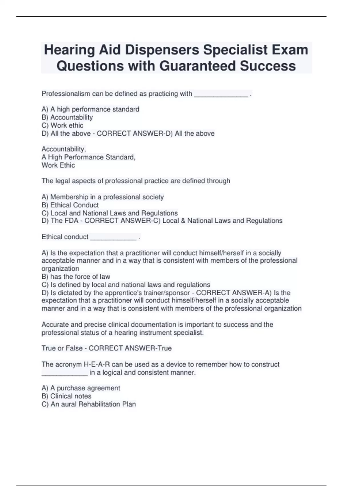 Hearing Aid Dispensers Specialist Exam Questions with Guaranteed Success Professionalism can be defined as practicing with ______________ . A) A high performance standard B) Accountability C) Work ethic D) All the above - CORRECT ANSWER-D) All the above Accountability, A High Performance Standard, Work Ethic The legal aspects of professional practice are defined through A) Membership in a professional society B) Ethical Conduct C) Local and National Laws and Regulations D) The FDA - CORRECT ANSWER-C) Local & National Laws and Regulations Ethical conduct ____________ . A) Is the expectation that a practitioner will conduct himself/herself in a socially acceptable manner and in a way that is consistent with members of the professional organization B) has the force of law C) Is defined by local and national laws and regulations D) Is dictated by the apprentice's trainer/sponsor - CORRECT ANSWER-A) Is the expectation that a practitioner will conduct himself/herself in a socially acceptable manner and in a way that is consistent with members of the professional organization Accurate and precise clinical documentation is important to success and the professional status of a hearing instrument specialist. True or False - CORRECT ANSWER-True The acronym H-E-A-R can be used as a device to remember how to construct ____________ in a logical and consistent manner. A) A purchase agreement B) Clinical notes C) An aural Rehabilitation Plan D) An amplification management program - CORRECT ANSWER-B) Clinical Notes Inter-professional collaboration leads to ___________ . A) More Referrals B) Greater Status C) Certification D) Improved Patient/client care - CORRECT ANSWER-D) Improved patient/client care A code of ethics provides guiding principles for professional conduct and may be used to help you resolve potential conflicts of interest. True or False - CORRECT ANSWER-True Lifelong learning is another term for ______________ . A) Certification B) Continued professional development C) adult education D) Licensure - CORRECT ANSWER-B) Continued professional development The development of a professional library is __________ . A) A waste of time and space B) A pursuit of true professionals C) Not necessary in the digital world D) Required by law - CORRECT ANSWER-B) A pursuit of true professionals "Ethics" A) Represents judicial decisions and legislative action B) Is what HIPAA regulates C) Reflects norms that guide human conduct of behavior D) Is of no concern to the hearing aid specialist - CORRECT ANSWER-C) Reflects norms that guide human conduct of behavior A violation of a Code of Ethical Conduct can result in A) Sanctions by the professional society in which you hold membership B) Criminal and civil penalties C) Revocation of licensure/certification D) All of the above - CORRECT ANSWER-D) All of the above Societal expectations determine public policy which is then formulated into professional Codes of Ethics that state how members of that group are expected to act and interact with others. True or False - CORRECT ANSWER-True Law formally codifies ethical dilemmas into A) Codes of Ethics B) Written form and specifies sanctions for non-compliance C) The licensing examination D) Difficult Scenarios for the hearing aid specialist - CORRECT ANSWER-B) Written form and specifies sanctions for non-compliance Consumer protections laws are enforced alongside other statutes True or False - CORRECT ANSWER-True It is the responsibility of _______________ to be knowledgeable of the laws and codes of conduct that impact of hearing instrument specialists. A) The apprentice/trainee B) The trainer C) The employer D) All the above - CORRECT ANSWER-D) All the above A pure tone is specified in __________ . A) Decibels B) Acoustics C) Hertz or cycles per second D) Sound pressure level - CORRECT ANSWER-C) Hertz or cycles per second Human hearing extends over such a vast intensity range of ___________ dynes/cm^2 which is compressed into a range of _________ decibels. A) 0.0002 to 1000 ; 0 to 140 B) 0 to 140 ; 0.0002 to 1000 C) 0.0002 to 140 ; 0 to 140 D) 0.02 to 100 ; 0 to 140 - CORRECT ANSWER-A) 0.0002 to 1000 ; 0 to 140 The difference in phase for sounds arriving simultaneously at both ears contributes to a listener's ability to localize a sound source. True or False - CORRECT ANSWER-True A shorter wavelength results in a __________ . A) Lower Frequenc