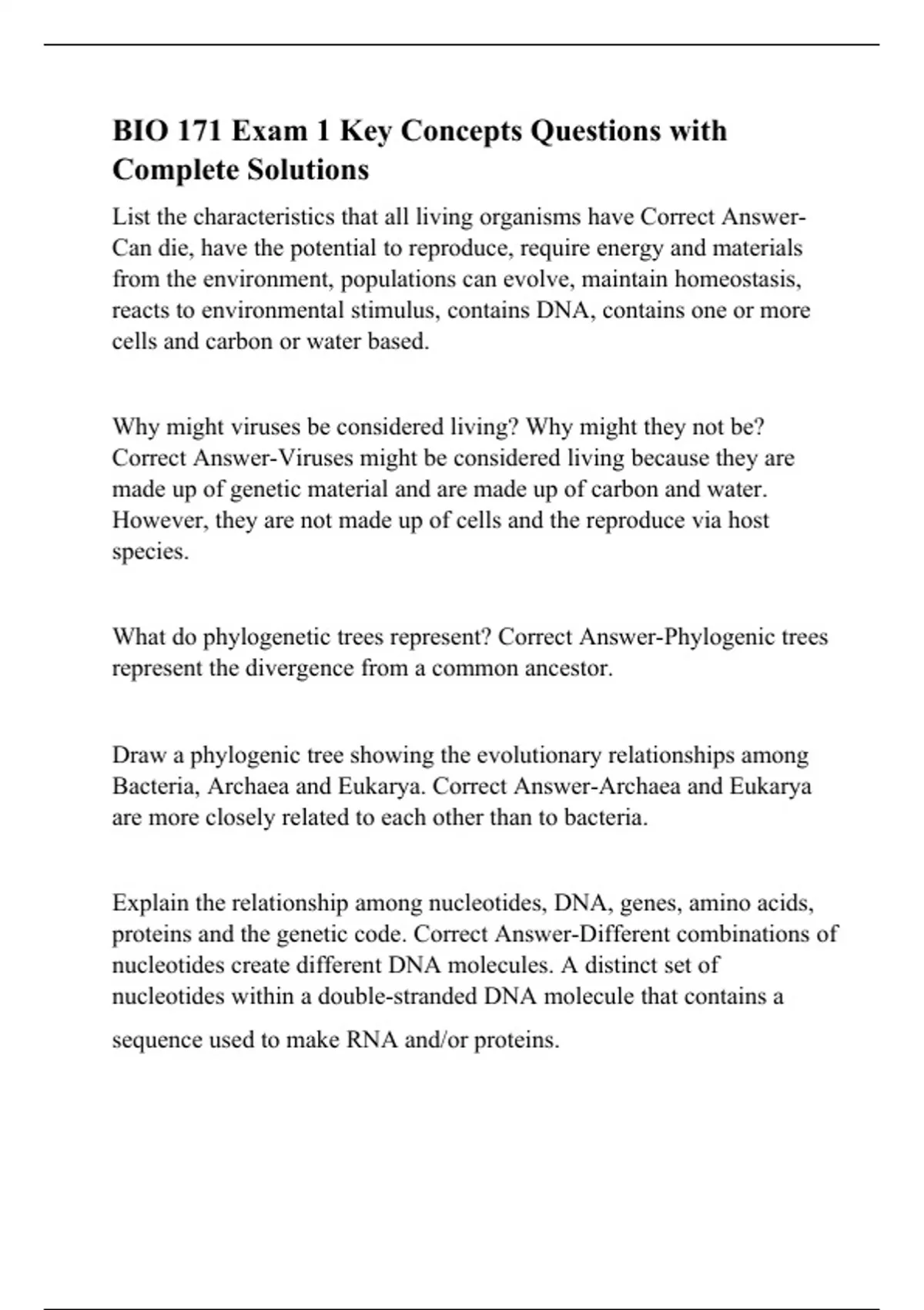 BIO 171 Exam 1 Key Concepts Questions with Complete Solutions