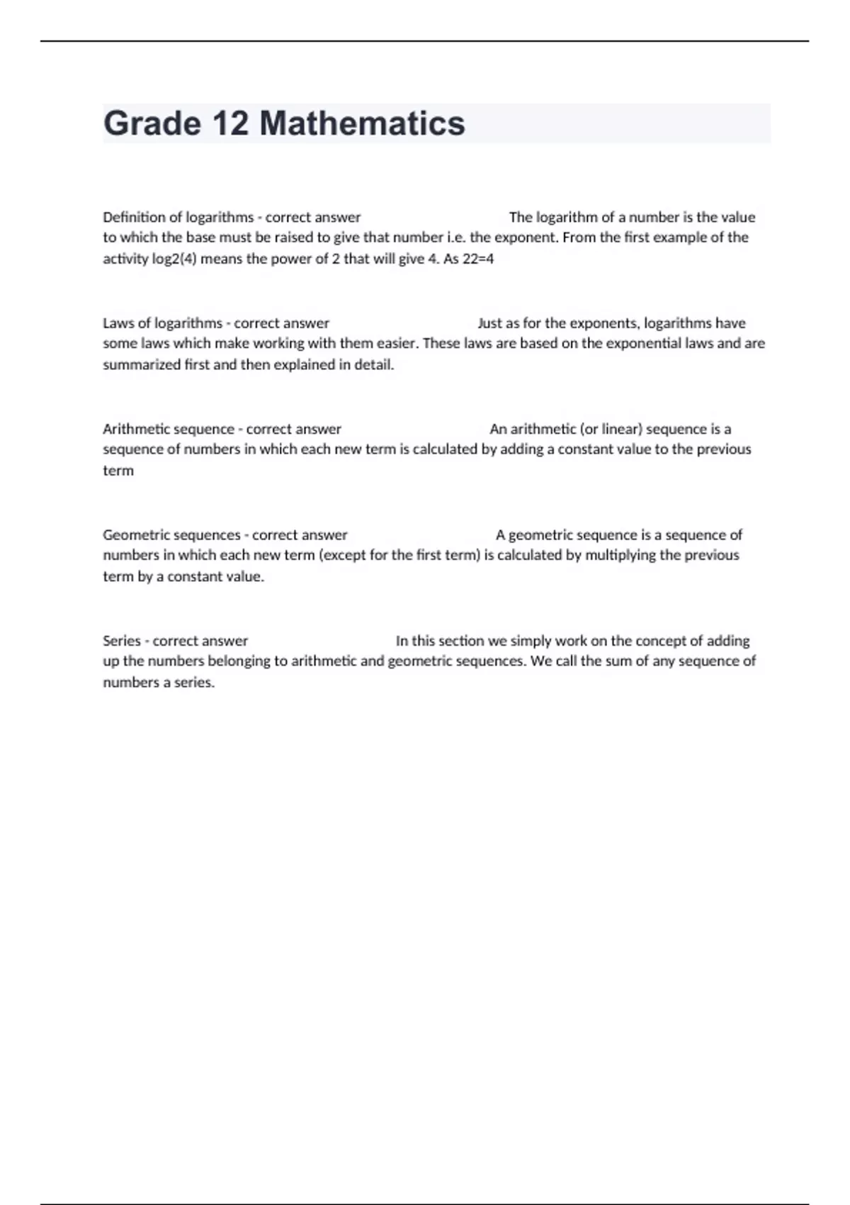 Definition of logarithms - correct answer The logarithm of a number is the value to which the base must be raised to give that number i.e. the exponent. From the first example of the activity log2(4) means the power of 2 that will give 4. As 22=4 Laws of logarithms - correct answer Just as for the exponents, logarithms have some laws which make working with them easier. These laws are based on the exponential laws and are summarized first and then explained in detail. Arithmetic sequence - correct answer An arithmetic (or linear) sequence is a sequence of numbers in which each new term is calculated by adding a constant value to the previous term Geometric sequences - correct answer A geometric sequence is a sequence of numbers in which each new term (except for the first term) is calculated by multiplying the previous term by a constant value. Series - correct answer In this section we simply work on the concept of adding up the numbers belonging to arithmetic and geometric sequences. We call the sum of any sequence of numbers a series.