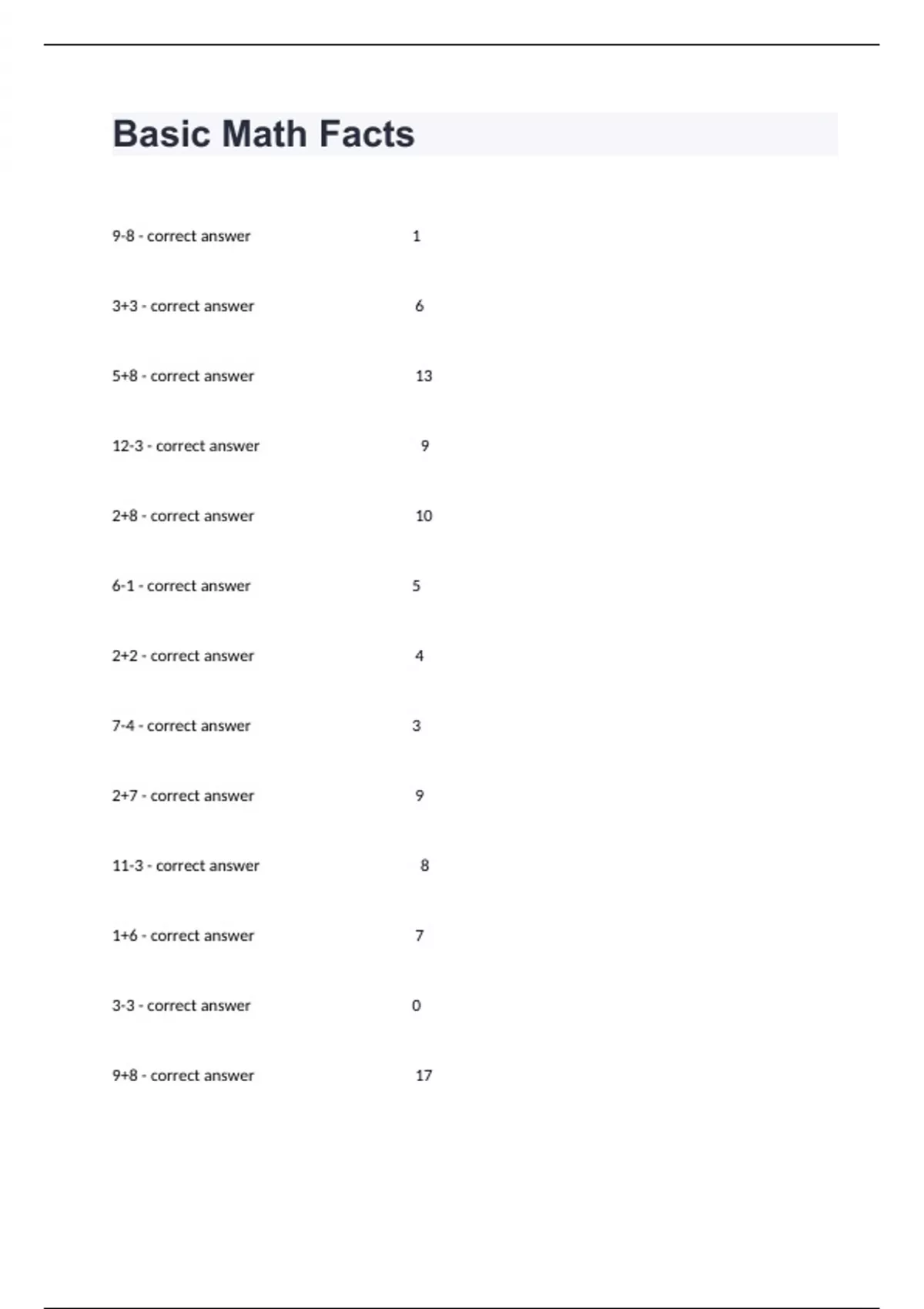 Basic Math Facts (Assignment) With Advanced Questions And Answers.
