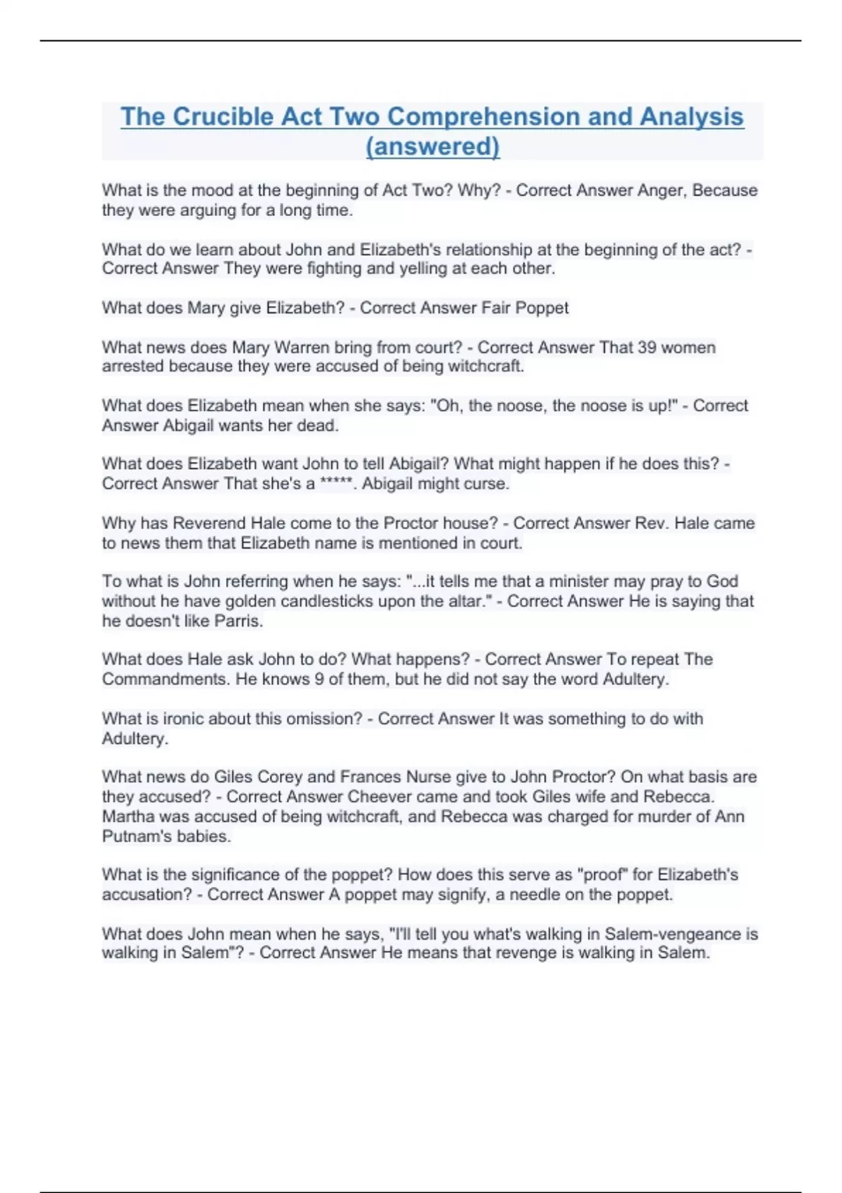 What is the mood at the beginning of Act Two? Why? - Correct Answer Anger, Because they were arguing for a long time. What do we learn about John and Elizabeth's relationship at the beginning of the act? - Correct Answer They were fighting and yelling at each other. What does Mary give Elizabeth? - Correct Answer Fair Poppet What news does Mary Warren bring from court? - Correct Answer That 39 women arrested because they were accused of being witchcraft. What does Elizabeth mean when she says: "Oh, the noose, the noose is up!" - Correct Answer Abigail wants her dead. What does Elizabeth want John to tell Abigail? What might happen if he does this? - Correct Answer That she's a *****. Abigail might curse. Why has Reverend Hale come to the Proctor house? - Correct Answer Rev. Hale came to news them that Elizabeth name is mentioned in court. To what is John referring when he says: "...it tells me that a minister may pray to God without he have golden candlesticks upon the altar." - Correct Answer He is saying that he doesn't like Parris. What does Hale ask John to do? What happens? - Correct Answer To repeat The Commandments. He knows 9 of them, but he did not say the word Adultery. What is ironic about this omission? - Correct Answer It was something to do with Adultery. What news do Giles Corey and Frances Nurse give to John Proctor? On what basis are they accused? - Correct Answer Cheever came and took Giles wife and Rebecca. Martha was accused of being witchcraft, and Rebecca was charged for murder of Ann Putnam's babies. What is the significance of the poppet? How does this serve as "proof" for Elizabeth's accusation? - Correct Answer A poppet may signify, a needle on the poppet. What does John mean when he says, "I'll tell you what's walking in Salem-vengeance is walking in Salem"? - Correct Answer He means that revenge is walking in Salem.