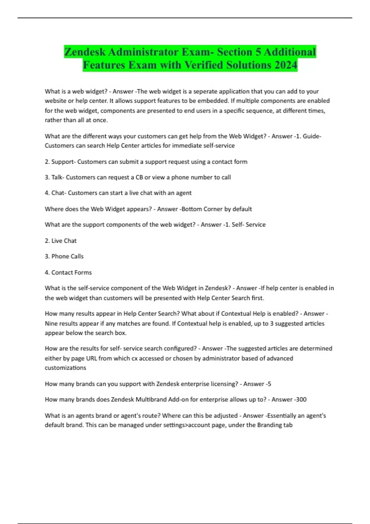 Zendesk Administrator Exam- Section 5 Additional Features Exam with Verified Solutions 2024 What is a web widget? - Answer -The web widget is a seperate application that you can add to your website or help center. It allows support features to be embedded. If multiple components are enabled for the web widget, components are presented to end users in a specific sequence, at different times, rather than all at once. What are the different ways your customers can get help from the Web Widget? - Answer -1. GuideCustomers can search Help Center articles for immediate self-service 2. Support- Customers can submit a support request using a contact form 3. Talk- Customers can request a CB or view a phone number to call 4. Chat- Customers can start a live chat with an agent Where does the Web Widget appears? - Answer -Bottom Corner by default What are the support components of the web widget? - Answer -1. Self- Service 2. Live Chat 3. Phone Calls 4. Contact Forms What is the self-service component of the Web Widget in Zendesk? - Answer -If help center is enabled in the web widget than customers will be presented with Help Center Search first. How many results appear in Help Center Search? What about if Contextual Help is enabled? - Answer - Nine results appear if any matches are found. If Contextual help is enabled, up to 3 suggested articles appear below the search box. How are the results for self- service search configured? - Answer -The suggested articles are determined either by page URL from which cx accessed or chosen by administrator based of advanced customizations How many brands can you support with Zendesk enterprise licensing? - Answer -5 How many brands does Zendesk Multibrand Add-on for enterprise allows up to? - Answer -300 What is an agents brand or agent's route? Where can this be adjusted - Answer -Essentially an age