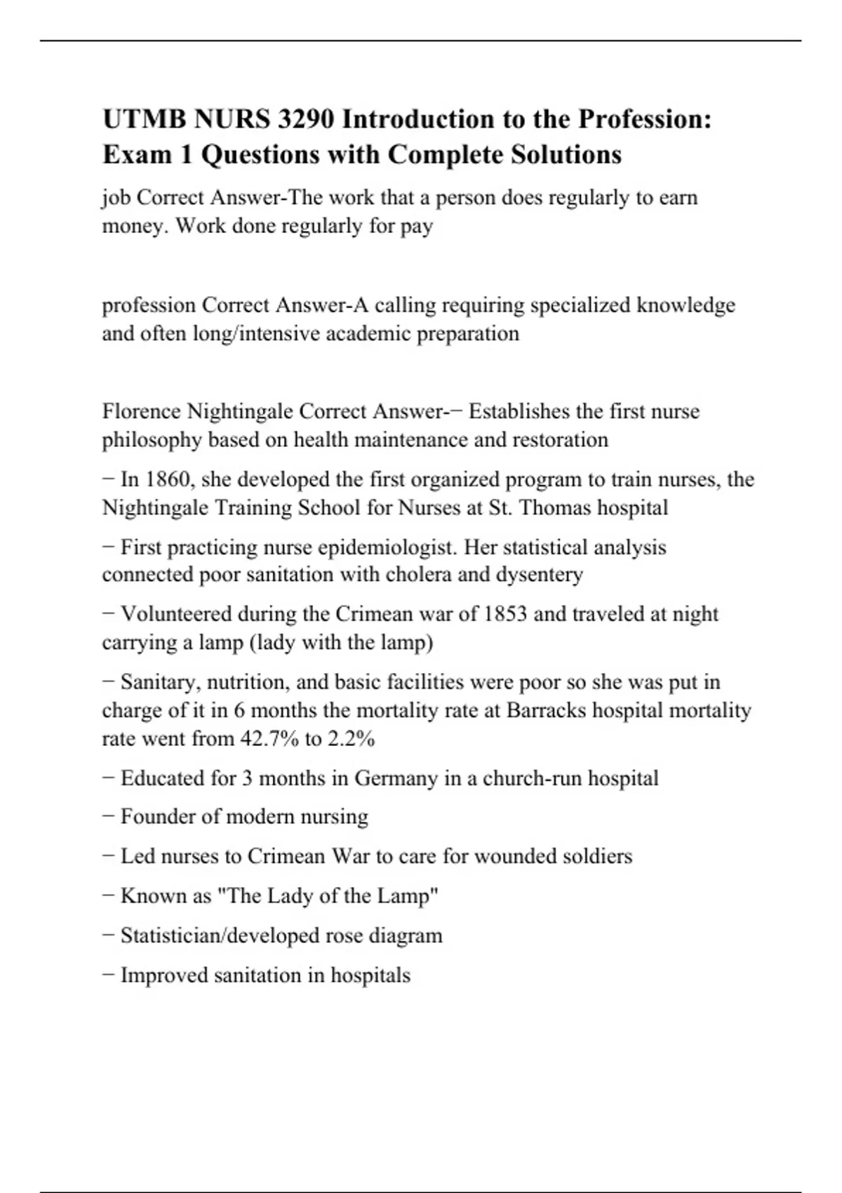 UTMB NURS 3290 Introduction to the Profession: Exam 1 Questions with Complete Solutions