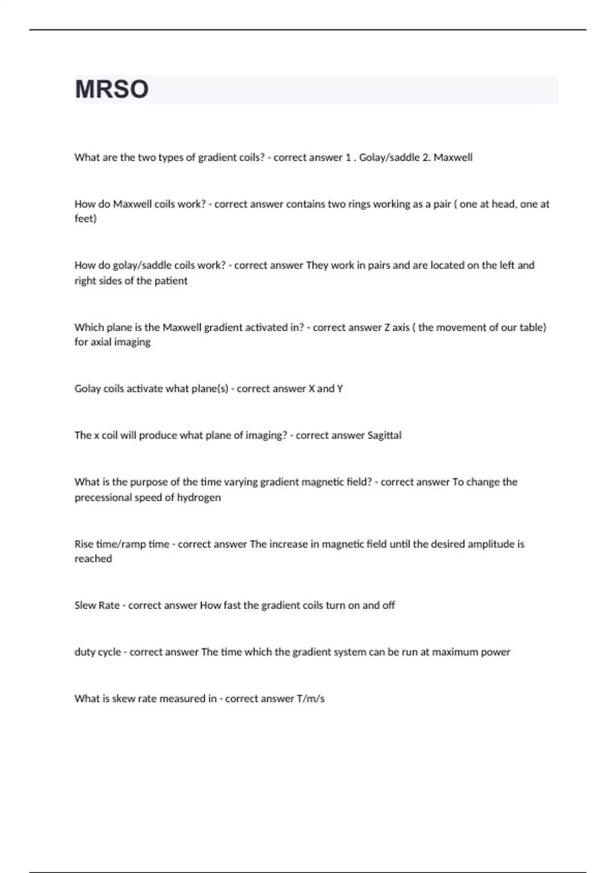 MRSOWhat are the two types of gradient coils? - correct answer 1 . Golay/saddle 2. Maxwell How do Maxwell coils work? - correct answer contains two rings working as a pair ( one at head, one at feet) How do golay/saddle coils work? - correct answer They work in pairs and are located on the left and right sides of the patient Which plane is the Maxwell gradient activated in? - correct answer Z axis ( the movement of our table) for axial imaging Golay coils activate what plane(s) - correct answer X and Y The x coil will produce what plane of imaging? - correct answer Sagittal What is the purpose of the time varying gradient magnetic field? - correct answer To change the precessional speed of hydrogen Rise time/ramp time - correct answer The increase in magnetic field until the desired amplitude is reached Slew Rate - correct answer How fast the gradient coils turn on and off duty cycle - correct answer The time which the gradient system can be run at maximum power What is skew rate measured in - correct answer T/m/s