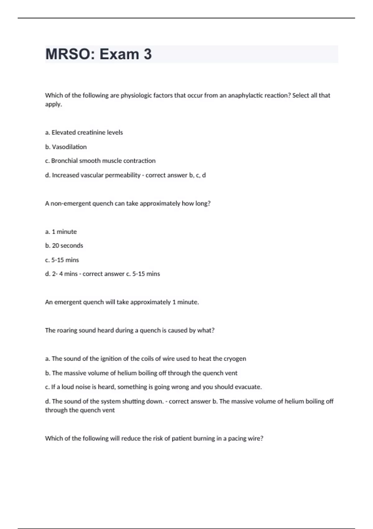MRSO: Exam 3Which of the following are physiologic factors that occur from an anaphylactic reaction? Select all that apply. a. Elevated creatinine levels b. Vasodilation c. Bronchial smooth muscle contraction d. Increased vascular permeability - correct answer b, c, d A non-emergent quench can take approximately how long? a. 1 minute b. 20 seconds c. 5-15 mins d. 2- 4 mins - correct answer c. 5-15 mins An emergent quench will take approximately 1 minute. The roaring sound heard during a quench is caused by what? a. The sound of the ignition of the coils of wire used to heat the cryogen b. The massive volume of helium boiling off through the quench vent c. If a loud noise is heard, something is going wrong and you should evacuate. d. The sound of the system shutting down. - correct answer b. The massive volume of helium boiling off through the quench vent Which of the following will reduce the risk of patient burning in a pacing wire?
