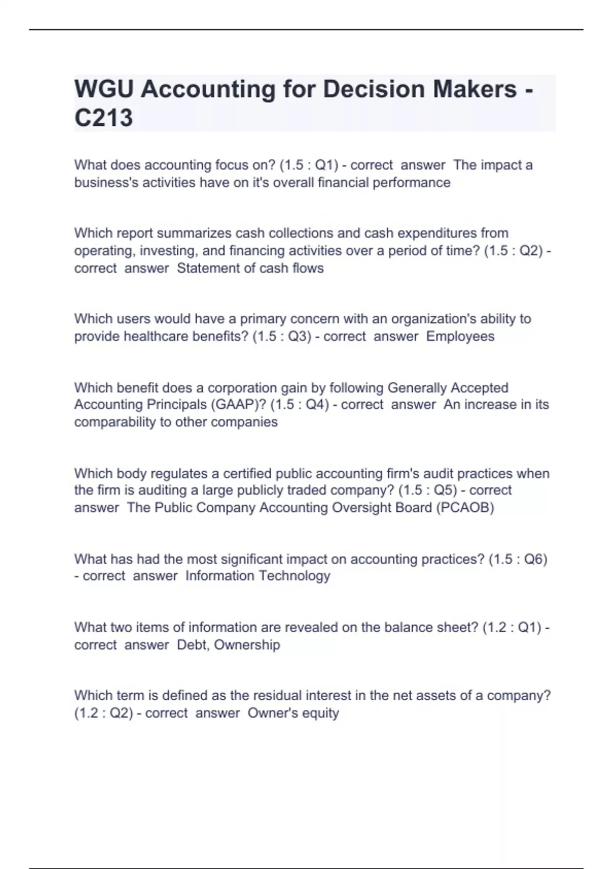 WGU Accounting for Decision Makers Question and answers correctly solved 2024 What does accounting focus on? (1.5 : Q1) - correct answer The impact a business's activities have on it's overall financial performance Which report summarizes cash collections and cash expenditures from operating, investing, and financing activities over a period of time? (1.5 : Q2) - correct answer Statement of cash flows Which users would have a primary concern with an organization's ability to provide healthcare benefits? (1.5 : Q3) - correct answer Employees Which benefit does a corporation gain by following Generally Accepted Accounting Principals (GAAP)? (1.5 : Q4) - correct answer An increase in its comparability to other companies Which body regulates a certified public accounting firm's audit practices when the firm is auditing a large publicly traded company? (1.5 : Q5) - correct answer The Public Company Accounting Oversight Board (PCAOB) What has had the most significant impact on accounting practices? (1.5 : Q6) - correct answer Information Technology What two items of information are revealed on the balance sheet? (1.2 : Q1) - correct answer Debt, Ownership