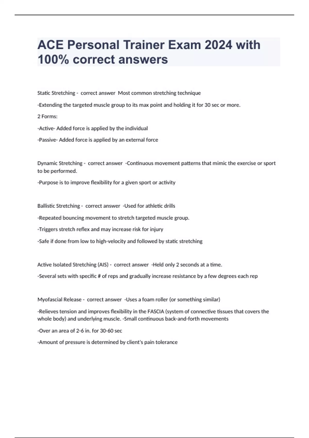 ACE Personal Trainer Exam 2024 Question and answers with 100% correct 2024Static Stretching - correct answer Most common stretching technique -Extending the targeted muscle group to its max point and holding it for 30 sec or more. 2 Forms: -Active- Added force is applied by the individual -Passive- Added force is applied by an external force Dynamic Stretching - correct answer -Continuous movement patterns that mimic the exercise or sport to be performed. -Purpose is to improve flexibility for a given sport or activity Ballistic Stretching - correct answer -Used for athletic drills -Repeated bouncing movement to stretch targeted muscle group. -Triggers stretch reflex and may increase risk for injury -Safe if done from low to high-velocity and followed by static stretching Active Isolated Stretching (AIS) - correct answer -Held only 2 seconds at a time. -Several sets with specific # of reps and gradually increase resistance by a few degrees each rep Myofascial Release - correct answer -Uses a foam roller (or something similar) -Relieves tension and improves flexibility in the FASCIA (system of connective tissues that covers the whole body) and underlying muscle. -Small continuous back-and-forth movements -Over an area of 2-6 in. for 30-60 sec -Amount of pressure is determined by client's pain tolerance
