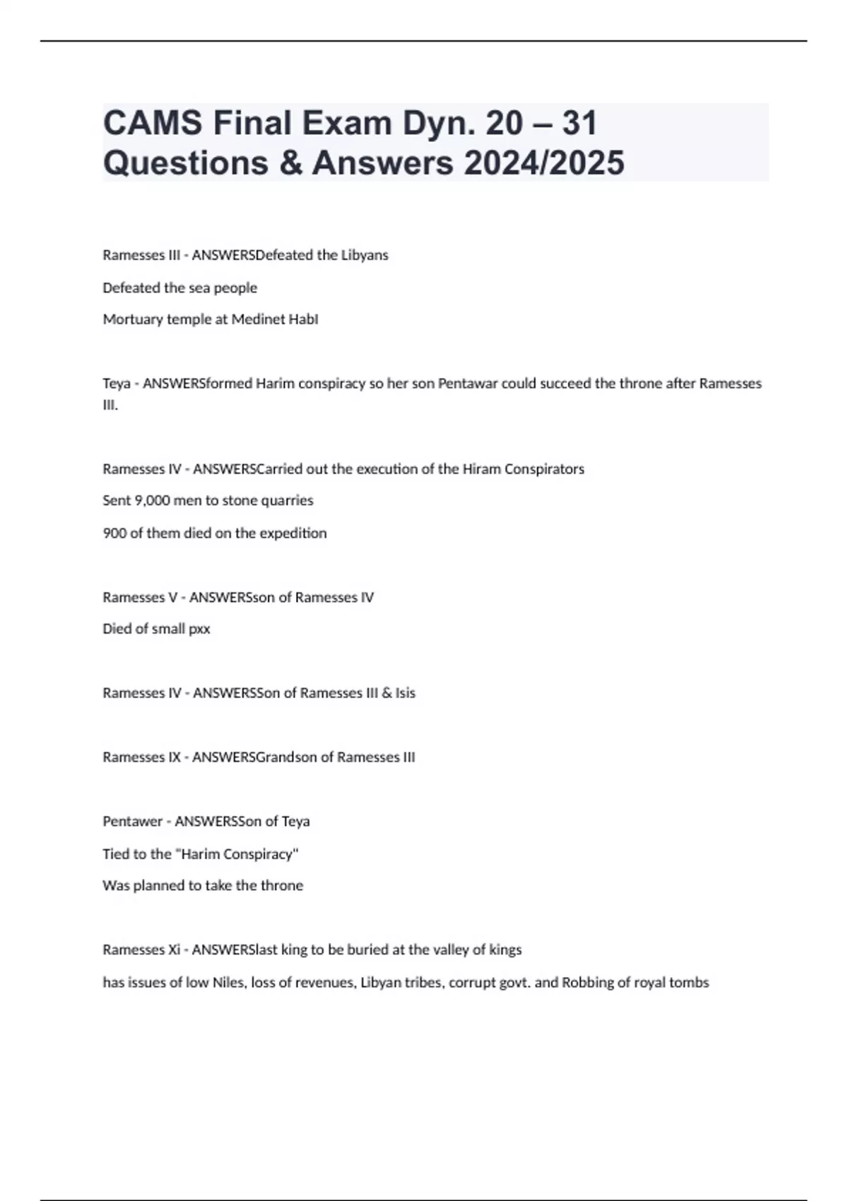 CAMS Final Exam Dyn. 20 – 31 Questions & Answers 2024/2025 Ramesses III - ANSWERSDefeated the Libyans Defeated the sea people Mortuary temple at Medinet HabI Teya - ANSWERSformed Harim conspiracy so her son Pentawar could succeed the throne after Ramesses III. Ramesses IV - ANSWERSCarried out the execution of the Hiram Conspirators Sent 9,000 men to stone quarries 900 of them died on the expedition Ramesses V - ANSWERSson of Ramesses IV Died of small pxx Ramesses IV - ANSWERSSon of Ramesses III & Isis Ramesses IX - ANSWERSGrandson of Ramesses III Pentawer - ANSWERSSon of Teya Tied to the "Harim Conspiracy" Was planned to take the throne Ramesses Xi - ANSWERSlast king to be buried at the valley of kings has issues of low Niles, loss of revenues, Libyan tribes, corrupt govt. and Robbing of royal tombs