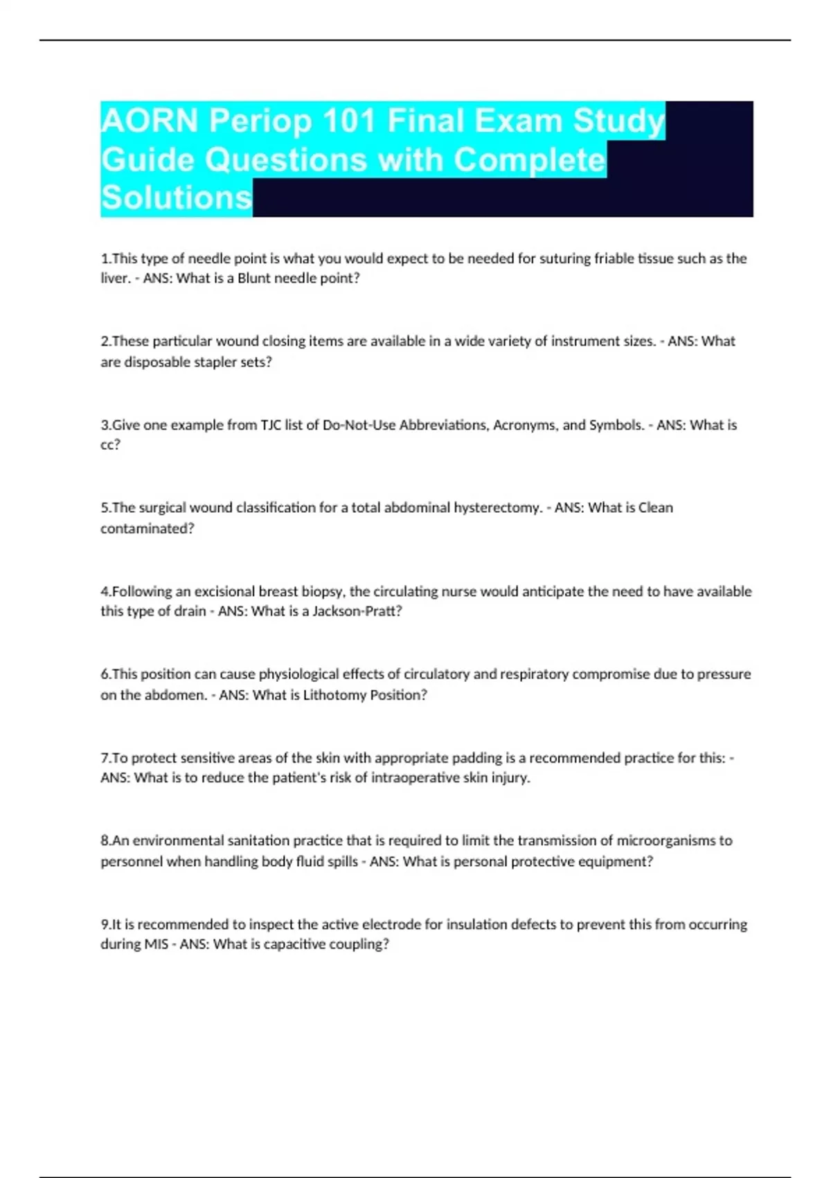 AORN Periop 101 Final Exam Study Guide Questions with Complete Solutions 1.This type of needle point is what you would expect to be needed for suturing friable tissue such as the liver. - ANS: What is a Blunt needle point? 2.These particular wound closing items are available in a wide variety of instrument sizes. - ANS: What are disposable stapler sets? 3.Give one example from TJC list of Do-Not-Use Abbreviations, Acronyms, and Symbols. - ANS: What is cc? 5.The surgical wound classification for a total abdominal hysterectomy. - ANS: What is Clean contaminated? 4.Following an excisional breast biopsy, the circulating nurse would anticipate the need to have available this type of drain - ANS: What is a Jackson-Pratt? 6.This position can cause physiological effects of circulatory and respiratory compromise due to pressure on the abdomen. - ANS: What is Lithotomy Position? 7.To protect sensitive areas of the skin with appropriate padding is a recommended practice for this: - ANS: What is to reduce the patient's risk of intraoperative skin injury. 8.An environmental sanitation practice that is required to limit the transmission of microorganisms to personnel when handling body fluid spills - ANS: What is personal protective equipment? 9.It is recommended to inspect the active electrode for insulation defects to prevent this from occurring during MIS - ANS: What is capacitive coupling? 10. According to AORN RP for positioning the patient, the perioperative nurse should: What is... a. Use a consistent method of procedure-specific position for each patient b. Rely on the surgeon's and anesthesia provider's assessments to guide positioning c. use additional precautions as appropriate based on unique patient considerations d. Depend on the patient's natural defense mechanisms to indicate the need for positioning alterations - ANS: c. use additional precautions as appropriate based on unique patient considerations 11.The disadvantage of using this type of wound closure is because they often cause more scarring than other skin closure methods. - ANS: What is skin clips? 12.An automatic intraoperative suspension of a do-not-resuscitate decision violates a patient's ethical right to... - ANS: What is Self-determination? 13. This type of human factor error is responsible when a perioperative nurse is trying to attend to several tasks at once - ANS: What is situational-based error? 14.Restricting pathogenic organisms from the patient, environment, equipment, and supplies is the definition of.... - ANS: What is aseptic technique? The most important consideration when selecting these materials is to prevent risk of contaminating patients with endogenous and exogenous microorganisms; and risk of exposing healthcare workers to patient's blood and body fluids - ANS: What are draping materials? 16.Patient and caregiver education for continuing post-op care at home is the primary focus of this Phase of post anesthesia care. - ANS: What is Phase II? 17.According to the Institute of medicine recommendations for improving patient safety, this organization has the greatest potential impact to make changes on improving pt safety - ANS: What are Healthcare organizations? 18. This statement about gloving technique is true What is... a. When gloving another person, always glove the left hand first. b. The scrub gown should be fastened in the back before donning gloves c. Open glove technique is used for initial donning of the sterile gown and gloves. d. Closed glove technique is used to glove the surgeon or assistant. - ANS: b. The scrub gown should be fastened in the back before donning gloves 19. Draping material is this source in the fire triangle? (fuel, ignition, oxidizer) - ANS: What is fuel source? 20. The safest way to pass a cutting instrument to a surgeon is: - ANS: What is place it in a designated neutral zone with a verbal cue 21. To place a patient safely in this particular position the knees are over the break in the procedure bed to allow for knee flexion. - ANS: What is Trendelenberg? 22. A packaging system for items undergoing sterilization should possess this characteristic: What is.... 1. Made of only disposable materials 2. to permit aseptic delivery of contents to the sterile field 3. Maintain sterility of the items for a specified length of time. 4. Compatible with all sterilization processes - ANS: 2. to permit aseptic delivery of contents to the sterile field 23. Silicone catheters should be stocked on this particular cart in the surgical suite. - ANS: What is a Latex-safe cart? 24. Open this package carefully over a small basin to prevent splashing of the packaging solution. - ANS: What is handling natural absorbable sutures (plain, chromic) 25. An example of administrative controls to assure safe use of lasers, is the appointment of a person in this role: - ANS: What is a laser safety officer? 26. This statement about the perioperative nurse's role in bioethical decision making is most justifiable. The perioperative nurse should... WHAT IS...