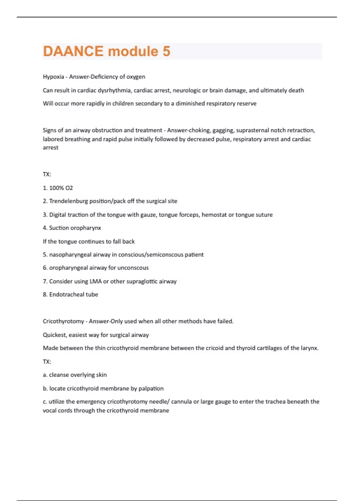 Hypoxia - Answer-Deficiency of oxygen Can result in cardiac dysrhythmia, cardiac arrest, neurologic or brain damage, and ultimately death Will occur more rapidly in children secondary to a diminished respiratory reserve Signs of an airway obstruction and treatment - Answer-choking, gagging, suprasternal notch retraction, labored breathing and rapid pulse initially followed by decreased pulse, respiratory arrest and cardiac arrest TX: 1. 100% O2 2. Trendelenburg position/pack off the surgical site 3. Digital traction of the tongue with gauze, tongue forceps, hemostat or tongue suture 4. Suction oropharynx If the tongue continues to fall back 5. nasopharyngeal airway in conscious/semiconscous patient 6. oropharyngeal airway for unconscous 7. Consider using LMA or other supraglottic airway 8. Endotracheal tube Cricothyrotomy - Answer-Only used when all other methods have failed. Quickest, easiest way for surgical airway Made between the thin cricothyroid membrane between the cricoid and thyroid cartilages of the larynx. TX: a. cleanse overlying skin b. locate cricothyroid membrane by palpation c. utilize the emergency cricothyrotomy needle/ cannula or large gauge to enter the trachea beneath the vocal cords through the cricothyroid membraned. attach the tube of the crycothyrotomy device to an oxygen source such as an anesthesia machine or ambu bag and ventilate 100% O2 Tracheostomy - Answer-Surgical airway below the level of the larynx into the trachea. Usually performed in a hospital setting Laryngospasm.. what, prevention and how to fix - Answer-WHAT? Protective relfex of the vocal cords Crowing sounds and labored respiratory efforts Characterized by cessation of crowing sounds, suprasternal retraction and paradoxical chest movement ("rocking" pattern of the chest and abdomen) Prevention: Proper pack placement or throat partition, changing packs and partitions when necessary, adequate suctioning, control of secretions and adequate anesthesia levels. TX: a. 100% O2 b. proper head position/maintain airway c. pack off surgical site d. suction oral cavity and oropharynx with tonsil suction e. postive pressure-100% O2 w/mask f. administer Succs until spontaneous respiration has resumed. Succinylcholine - Answer-Can trigger MH Can lead to bradycardia in peds patients In children, atropine should be administered concomitantly with succinylcholine to prevent bradycardia and life threatening dysrhythmias May cause cessation of breathingBronchospasm. WHAT? TX? - Answer-Contraction of the smooth muscles of the small bronchi and bronchioles. Restriction of air to and from the lungs. More difficult expiration than inspiration. Exhibits labored breathing, expiration difficulty and signs of a diminishing respiratory status. Wheezing and often show labored breathing. Cyanosis or decreased ventilation patterns on the capnograph TX: a. 100% O2 b. albuterol inhalation (Beta-2 antagonist) c. Ipratropium bromide- 2 puffs STAT d. Epinephrine e. Intubation/ventilation f. steroid injection-dec, or solu-cortef g. diphenhydramine h. activate EMS if bronchospasm is not broken Emesis w/ aspiration. What? TX? - Answer-Aspiration occurs when the contents of the stomach enter the lungs secondary to emesis or when a foreign body or fluid inadvertantly enters the lungs from the oral pharyngeal cavity through the larynx. Acidic gastric contents cause severe reaction within the lungs that results in damage to the endolitheal lining of the lungs-rales, dyspnea and tachycardia TX: a. activate EMS b. 100% O2 c. Trendelenburg position d. Tonsil suction e. removal of visible foreign material f. intubation g. transport to hospital Hyperventilation - Answer-Breathing at a faster rate than normalTriggered by a change in the body's natural balance of oxygen and carbon dioxide. Results in the patient exhaling too much CO2 and becoming light headed and anxious. Early TX: a. terminate procedure/remove foreign bodies from mouth and surgical instruments from view. b. maintain airway c. verbally try to calm the patient d. monitor vitals e. do NOT give O2 f. breath into a paper bag Advanced TX: a. non-sedated pt→ admin IV midaz, diazepam, prop, etc b. monitor vitals c. discontinue rebreathing bag as breathing returns to normal. d. activate EMS if condition deteriorates Angina - Answer-Chest pain that begins in the center of the chest and may radiate to any area above the diaphragm. Primary symptom of coronary artery disease. Caused by a spasm in the coronary arteries. Occurs at rest→ atypical/unstable and its particularly omnious Nitrates - used to treat