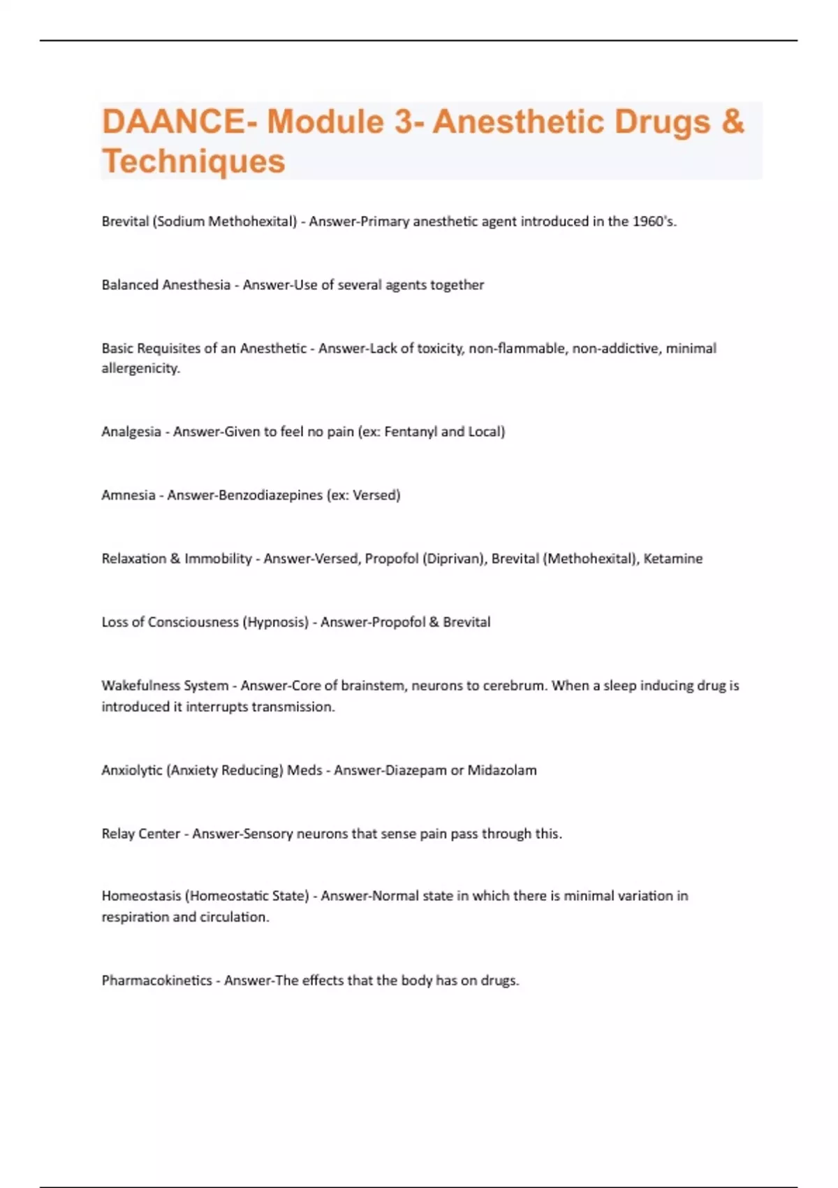 Brevital (Sodium Methohexital) - Answer-Primary anesthetic agent introduced in the 1960's. Balanced Anesthesia - Answer-Use of several agents together Basic Requisites of an Anesthetic - Answer-Lack of toxicity, non-flammable, non-addictive, minimal allergenicity. Analgesia - Answer-Given to feel no pain (ex: Fentanyl and Local) Amnesia - Answer-Benzodiazepines (ex: Versed) Relaxation & Immobility - Answer-Versed, Propofol (Diprivan), Brevital (Methohexital), Ketamine Loss of Consciousness (Hypnosis) - Answer-Propofol & Brevital Wakefulness System - Answer-Core of brainstem, neurons to cerebrum. When a sleep inducing drug is introduced it interrupts transmission. Anxiolytic (Anxiety Reducing) Meds - Answer-Diazepam or Midazolam Relay Center - Answer-Sensory neurons that sense pain pass through this. Homeostasis (Homeostatic State) - Answer-Normal state in which there is minimal variation in respiration and circulation. Pharmacokinetics - Answer-The effects that the body has on drugs.Pharmacodynamics - Answer-The effects that the drug has on various body systems. Rapid Redistribution - Answer-Short acting drug only remain attached to the receptor sites for a short time and then move to the other tissues. PO (per os) - Answer-Through the mouth. (Delayed onset, unpredictable effects, patient compliance, not good when pt in nauseated) Subcutaneous (SQ) - Answer-Beneath the Skin (Absorption is somewhat delayed compared to IM or IV) Intramuscular (IM) - Answer-In the muscle (Unpredictable onset of drug effect, cannot titrate the dose) Intravenous (IV) - Answer-In the vein Inhalation Route - Answer-Inhaled (Very rapid absorption and titration) 4 Levels of Continuum - Answer-Minimal Sedation, Moderate Sedation, Deep Sedation (Analgesia), and General Anesthesia Minimal Sedation (Anxiolysis) - Answer-Normal response to verbal stimulation, cardiovascular function unaffected. Moderate Sedation (Conscious Sedation) - Answer-Normal response to verbal or light tactile stimulation with cardiovascular function usually maintained.Deep Sedation (Analgesia) - Answer-Not easily aroused but has purposeful response after repeated or painful stimulation. General Anesthesia - Answer-Not a rousable even with painful stimulation. Diffusion hypoxia - Answer-Nitrous Oxide rapidly moves from the blood to the alveoli of the lungs and displaces other gases, including oxygen. Hypoxia - Answer-Low levels of oxygen in the bodies tissues. Hypercarbia - Answer-An increased level of carbon dioxide. Anxiolytic - Answer-Triazolam, Diazepam, Modazolam