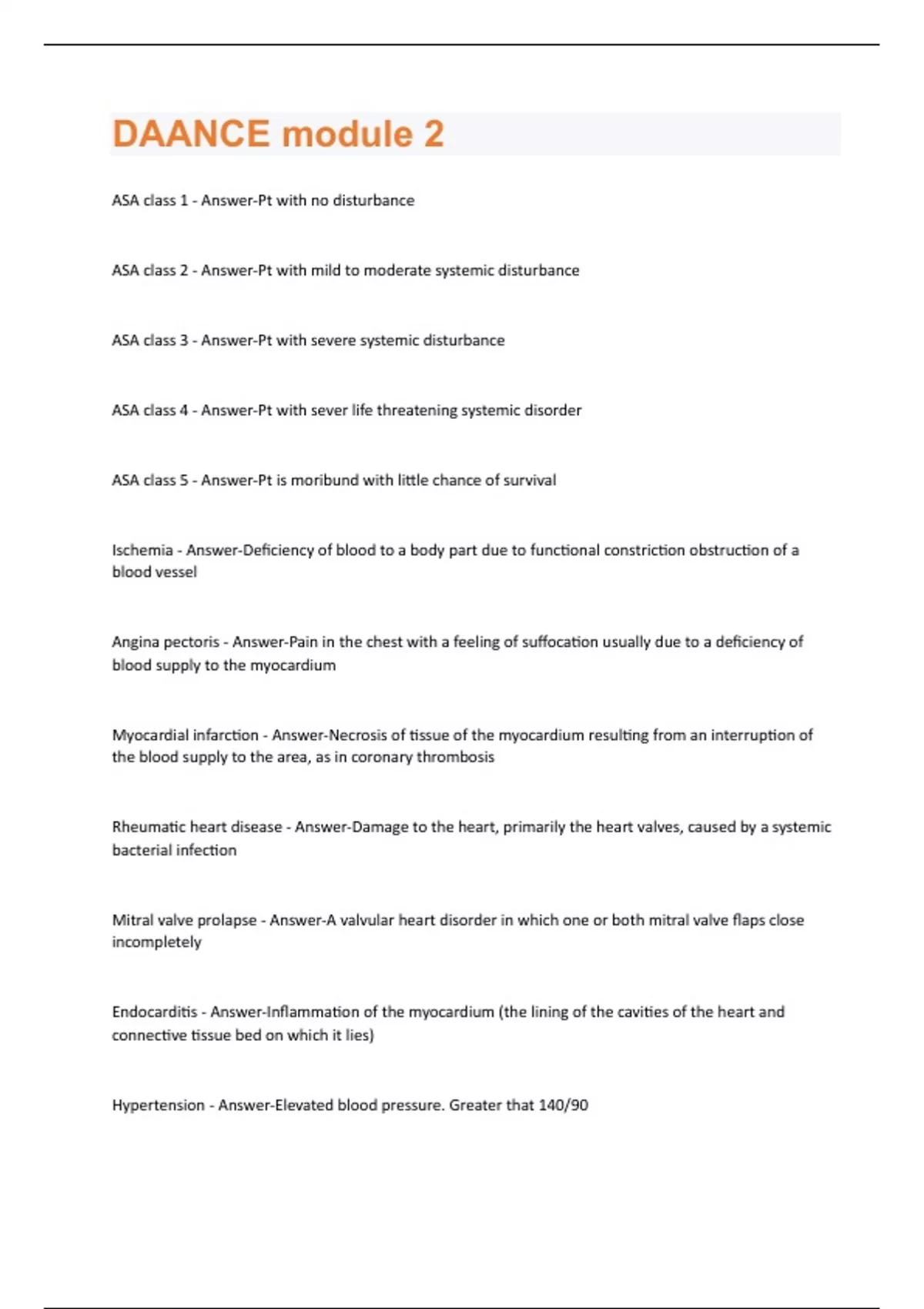ASA class 1 - Answer-Pt with no disturbance ASA class 2 - Answer-Pt with mild to moderate systemic disturbance ASA class 3 - Answer-Pt with severe systemic disturbance ASA class 4 - Answer-Pt with sever life threatening systemic disorder ASA class 5 - Answer-Pt is moribund with little chance of survival Ischemia - Answer-Deficiency of blood to a body part due to functional constriction obstruction of a blood vessel Angina pectoris - Answer-Pain in the chest with a feeling of suffocation usually due to a deficiency of blood supply to the myocardium Myocardial infarction - Answer-Necrosis of tissue of the myocardium resulting from an interruption of the blood supply to the area, as in coronary thrombosis Rheumatic heart disease - Answer-Damage to the heart, primarily the heart valves, caused by a systemic bacterial infection Mitral valve prolapse - Answer-A valvular heart disorder in which one or both mitral valve flaps close incompletely Endocarditis - Answer-Inflammation of the myocardium (the lining of the cavities of the heart and connective tissue bed on which it lies) Hypertension - Answer-Elevated blood pressure. Greater that 140/90Beta blockers - Answer-Medication to decrease the force and rate of contraction of the heart, eg, atenolol. Treats high blood pressure Vasodilators - Answer-Medications used to reduce the pressure in the vasculature, eg, Norvasc, Lisinopril, Diovan. Treats high blood pressure Diuretics - Answer-Medications to reduce the volume of fluid in the system (HCTZ, Lasix) promotes excretion of urine and decrease of blood volume. treats high blood pressure Congestive heart failure - Answer-A clinical syndrome due to heart disease and characterized by breathlessness and abnormal water and sodium retention, resulting in edema Digitalis - Answer-A pharmacologic agent used to treat congestive heart failure, A fib, atrial flutter and paroxysmal tachycardia. It increases the force of cardiac contraction Left sided heart failure - Answer-Left side of heart fails to pump blood out into the circulation efficiency, causing blood to back up to the LUNGS Right sides heart failure - Answer-Right side of the heart fails to pump blood efficiently to the lungs, causing blood to back up in the peripheral circulation, causing peripheral edema Congenital heart disease - Answer-Cardiac disease caused by a defect in the heart structure since birth Arrhythmia - Answer-Any variation from the normal rhythm of the heartbeat Dysrhythmia - Answer-Disturbance of cardiac rhythm Normal sinus rhythm - Answer-The normal rhythm of the heart containing P waves, QRS complexes and T waves with a regular rate of 60-100 bpmP wave - Answer-A wave appearing on an ECG tracing that reflects the electrical activity that produces contraction of atria. The 1st elevation on the ECG. QRS complex - Answer-An element appearing on an ECG tracing that reflects the activity that produces ventricular contraction. The heart is at rest. It is narrow and has a width of less than half of one large block T wave - Answer-The ECG wave form that represents repolarization of the ventricles PR interval - Answer-From the beginning of the p wave to the beginning of the r wave is less than the width of 1 wide block Automaticity - Answer-A condition of being automatic