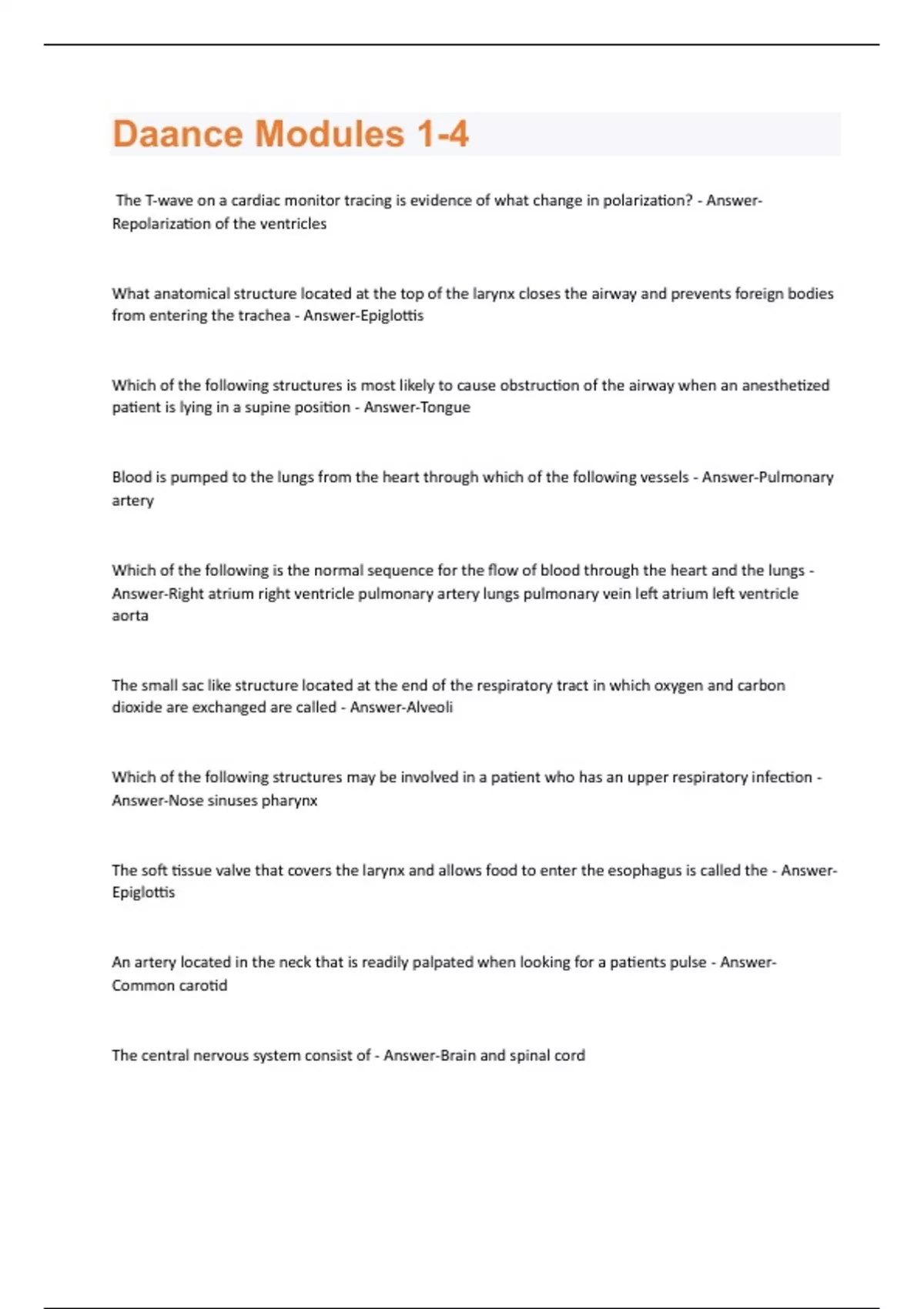 The T-wave on a cardiac monitor tracing is evidence of what change in polarization? - AnswerRepolarization of the ventricles What anatomical structure located at the top of the larynx closes the airway and prevents foreign bodies from entering the trachea - Answer-Epiglottis Which of the following structures is most likely to cause obstruction of the airway when an anesthetized patient is lying in a supine position - Answer-Tongue Blood is pumped to the lungs from the heart through which of the following vessels - Answer-Pulmonary artery Which of the following is the normal sequence for the flow of blood through the heart and the lungs - Answer-Right atrium right ventricle pulmonary artery lungs pulmonary vein left atrium left ventricle aorta The small sac like structure located at the end of the respiratory tract in which oxygen and carbon dioxide are exchanged are called - Answer-Alveoli Which of the following structures may be involved in a patient who has an upper respiratory infection - Answer-Nose sinuses pharynx The soft tissue valve that covers the larynx and allows food to enter the esophagus is called the - AnswerEpiglottis An artery located in the neck that is readily palpated when looking for a patients pulse - AnswerCommon carotid The central nervous system consist of - Answer-Brain and spinal cordA patient with a history of transient ischemic attaches (TIA'S) has had temporary lessening of - AnswerBlood supply to the brain Ischemic heart disease is a result of - Answer-Decreased blood flow in the coronary arteries The main purpose of the review of systems is to obtain a careful evaluation of the patients - AnswerMedical history A patient who has renal disease would be expected to have difficulty with - Answer-Drug excretion The medical history is not used to document - Answer-The socioeconomic status of the patient Congestive hear failure can result in all of the following - Answer-Bronchospasm Normal blood oxygen saturation in an ASA class I patient ranges from - Answer-95%-100% Which of the following statements about the ASA psychical status classification of patients is false - Answer-It allows the surgeon to anesthetize a class V patient routinely Patients with diabetes are at risk for oral and maxillofacial surgery because they - Answer-Are subject to postoperative infections A patient who has had a myocardial infarction should wait how many months before having elective surgery - Answer-2 months Diazepam (Valium) is used in outpatient oral and max surgery - Answer-To sedate the patient Barbiturates are detoxified primarily in the - Answer-Liver Rapid administration of anesthetic doses of methohexital (Brevital) can result in - Answer-Hiccups tachycardia respiratory depressionThe reasin methohexital (Brevital) is considered to be ultrashort acting because it is - Answer-Not as highly bound to fat as thiopental Oxygen is approximately what percent of room air - Answer-20% Naloxone (Narcan) is used primarily as - Answer-A narcotic antagonise Recovery from ketamine (Ketalar) anesthetic is sometimes associated with - Answer-Bad dreams Local anesthetic containing epinephrine should be used cautiously in patients who have - AnswerCardiac dysrhythmias Which of the following is a major advantage for using propofol (Diprivan) over methohexital (Brevital) - Answer-Lower incidence of nausea and a shorter duration Which of the following is an advantage of using a local anesthetic alone - Answer-The patient does not have to be npo A driver is not necessary How often should the function of a anesthesia mechanic be checked - Answer-Daily In the United States the standard color for nitrous oxide cylinder is - Answer-Blue Blood pressure levels will most likely be falsely low when using - Answer-A adult cuff on a small child A monitoring device that gives information about both circulation and ventilation is the - Answer-Pulse oximeterWhich of the following would be indicators of partial respiratory obstruction in a sedation patient - Answer-Gargling snoring high pitched crowiling or wheezing noted while monitoring with precordial stethoscope Ventilation can be monitored continuously by - Answer-Auscultation in the precordial or pretracheal region Observation of the rebreathing bag A rocking Or see sawing rhythm of the chest and abdomen may indicate - Answer-Airway obstruction An increased heart rate may be caused by - Answer-Painful stimulation