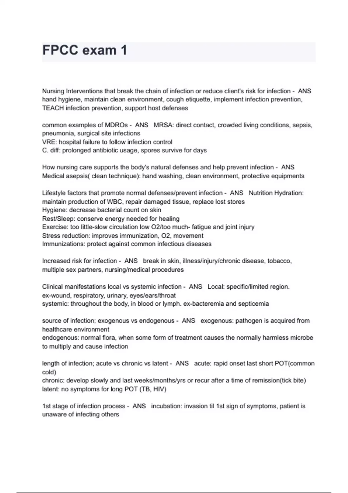 FPCC Exam 1 Questions And Answers Nursing Interventions that break the chain of infection or reduce client's risk for infection - ANS hand hygiene, maintain clean environment, cough etiquette, implement infection prevention, TEACH infection prevention, support host defenses common examples of MDROs - ANS MRSA: direct contact, crowded living conditions, sepsis, pneumonia, surgical site infections VRE: hospital failure to follow infection control C. diff: prolonged antibiotic usage, spores survive for days How nursing care supports the body's natural defenses and help prevent infection - ANS Medical asepsis( clean technique): hand washing, clean environment, protective equipments Lifestyle factors that promote normal defenses/prevent infection - ANS Nutrition Hydration: maintain production of WBC, repair damaged tissue, replace lost stores Hygiene: decrease bacterial count on skin Rest/Sleep: conserve energy needed for healing Exercise: too little-slow circulation low O2/too much- fatigue and joint injury Stress reduction: improves immunization, O2, movement Immunizations: protect against common infectious diseases Increased risk for infection - ANS break in skin, illness/injury/chronic disease, tobacco, multiple sex partners, nursing/medical procedures Clinical manifestations local vs systemic infection - ANS Local: specific/limited region. ex-wound, respiratory, urinary, eyes/ears/throat systemic: throughout the body, in blood or lymph. ex-bacteremia and septicemia source of infection; exogenous vs endogenous - ANS exogenous: pathogen is acquired from healthcare environment endogenous: normal flora, when some form of treatment causes the normally harmless microbe to multiply and cause infection length of infection; acute vs chronic vs latent - ANS acute: rapid onset last short POT(common cold) chronic: develop slowly and last weeks/months/yrs or recur after a time of remission(tick bite) latent: no symptoms for long POT (TB, HIV) 1st stage of infection process - ANS incubation: invasion til 1st sign of symptoms, patient is unaware of infecting others