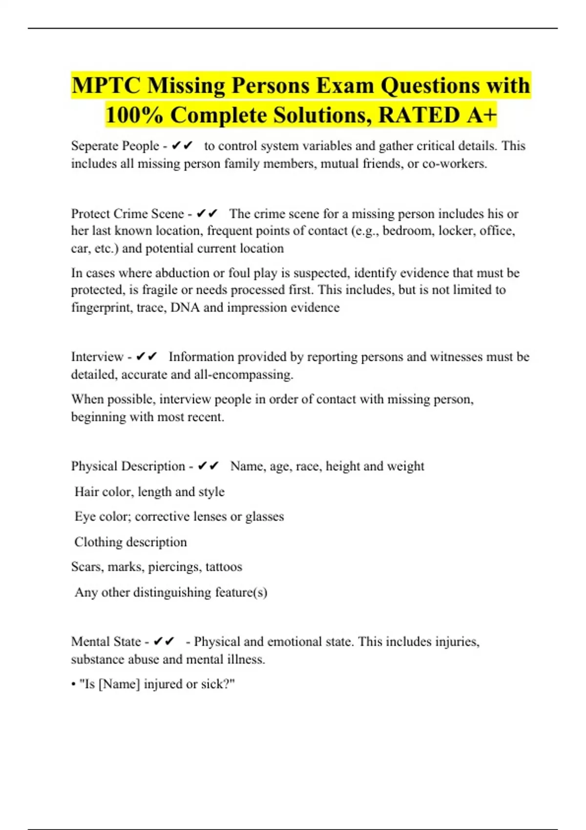 MPTC Missing Persons Exam Questions with 100% Complete Solutions, RATED A+