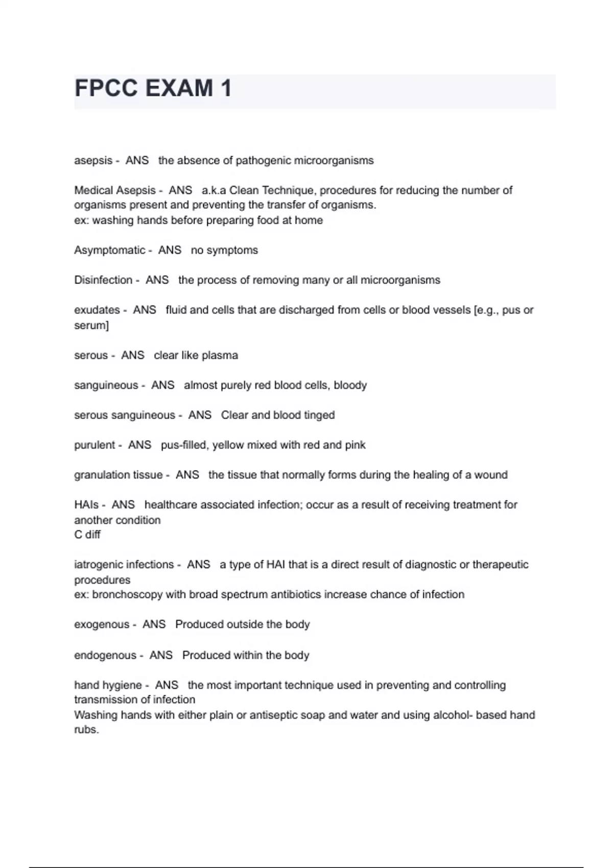 FPCC EXAM 1 QUESTIONS AND ANSWERS asepsis - ANS the absence of pathogenic microorganisms Medical Asepsis - ANS a.k.a Clean Technique, procedures for reducing the number of organisms present and preventing the transfer of organisms. ex: washing hands before preparing food at home Asymptomatic - ANS no symptoms Disinfection - ANS the process of removing many or all microorganisms exudates - ANS fluid and cells that are discharged from cells or blood vessels [e.g., pus or serum] serous - ANS clear like plasma sanguineous - ANS almost purely red blood cells, bloody serous sanguineous - ANS Clear and blood tinged purulent - ANS pus-filled, yellow mixed with red and pink granulation tissue - ANS the tissue that normally forms during the healing of a wound HAIs - ANS healthcare associated infection; occur as a result of receiving treatment for another condition C diff iatrogenic infections - ANS a type of HAI that is a direct result of diagnostic or therapeutic procedures ex: bronchoscopy with broad spectrum antibiotics increase chance of infection exogenous - ANS Produced outside the body endogenous - ANS Produced within the body hand hygiene - ANS the most important technique use