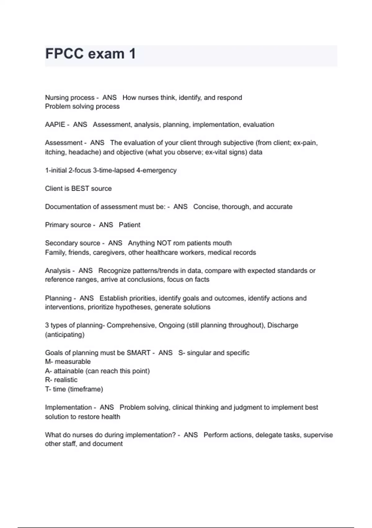 FPCC Exam 1 Questions And Answers All Correct Nursing process - ANS How nurses think, identify, and respond Problem solving process AAPIE - ANS Assessment, analysis, planning, implementation, evaluation Assessment - ANS The evaluation of your client through subjective (from client; ex-pain, itching, headache) and objective (what you observe; ex-vital signs) data 1-initial 2-focus 3-time-lapsed 4-emergency Client is BEST source Documentation of assessment must be: - ANS Concise, thorough, and accurate Primary source - ANS Patient Secondary source - ANS Anything NOT rom patients mouth Family, friends, caregivers, other healthcare workers, medical records Analysis - ANS Recognize patterns/trends in data, compare with expected standards or reference ranges, arrive at conclusions, focus on facts Planning - ANS Establish priorities, identify goals and outcomes, identify actions and interventions, prioritize hypotheses, generate solutions 3 types of planning- Comprehensive, Ongoing (still planning throughout), Discharge (anticipating) Goals of planning must be SMART - ANS S- singular and specific M- measurable A- attainable (can reach this point) R- realistic T- time (timeframe) Implementation - ANS Problem solving, clinical thinking and judgment to implement best solution to restore health What do nurses do during implementation? - ANS Perform actions, delegate tasks, supervise other staff, and document