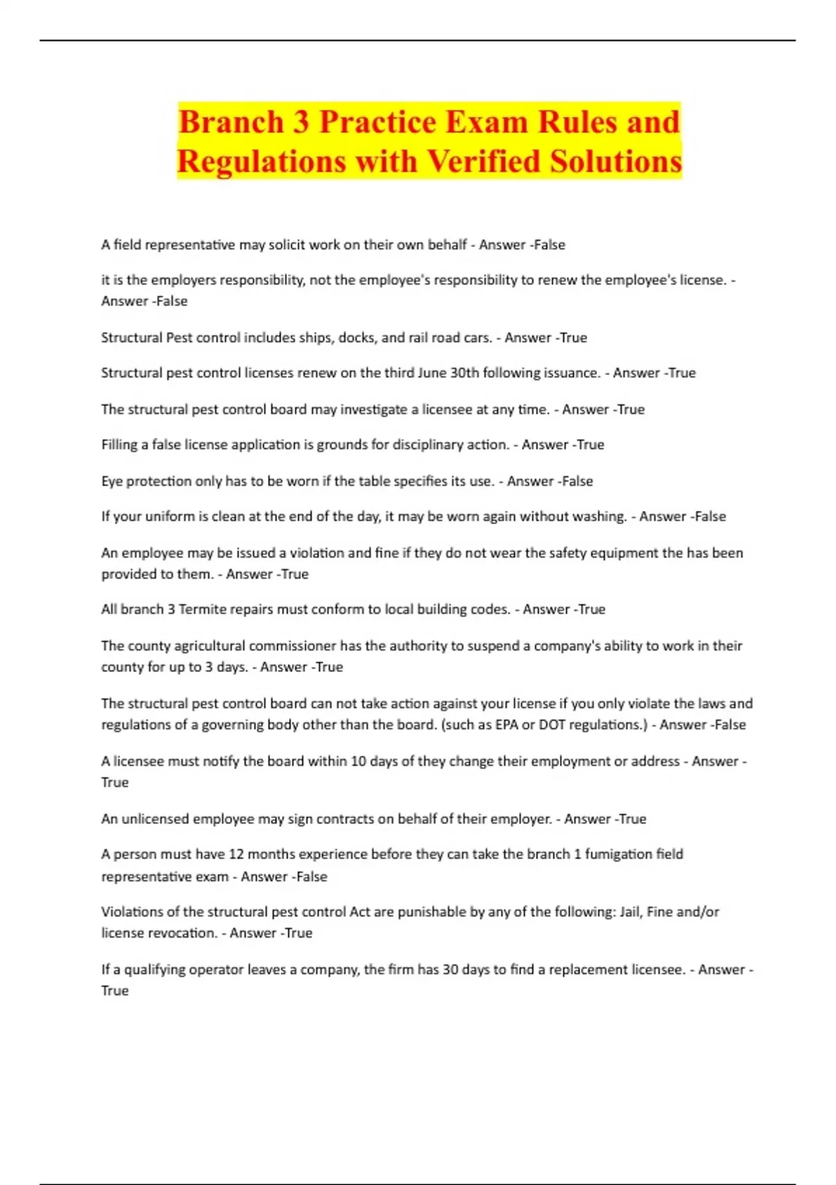 Branch 3 Practice Exam Rules and Regulations with Verified Solutions A field representative may solicit work on their own behalf - Answer -False it is the employers responsibility, not the employee's responsibility to renew the employee's license. - Answer -False Structural Pest control includes ships, docks, and rail road cars. - Answer -True Structural pest control licenses renew on the third June 30th following issuance. - Answer -True The structural pest control board may investigate a licensee at any time. - Answer -True Filling a false license application is grounds for disciplinary action. - Answer -True Eye protection only has to be worn if the table specifies its use. - Answer -False If your uniform is clean at the end of the day, it may be worn again without washing. - Answer -False An employee may be issued a violation and fine if they do not wear the safety equipment the has been provided to them. - Answer -True All branch 3 Termite repairs must conform to local building codes. - Answer -T