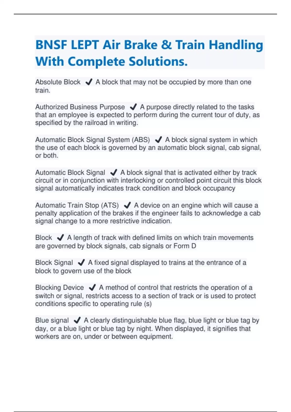 BNSF LEPT Air Brake & Train Handling With Complete Solutions | Latest 2024/2025 Absolute Block ️ A block that may not be occupied by more than one train. Authorized Business Purpose ️ A purpose directly related to the tasks that an employee is expected to perform during the current tour of duty, as specified by the railroad in writing. Automatic Block Signal System (ABS) ️ A block signal system in which the use of each block is governed by an automatic block signal, cab signal, or both. Automatic Block Signal ️ A block signal that is activated either by track circuit or in conjunction with interlocking or controlled point circuit this block signal automatically indicates track condition and block occupancy Automatic Train Stop (ATS) ️ A device on an engine which will cause a penalty application of the brakes if the engineer fails to acknowledge a cab signal change to a more restrictive indication. Block ️ A length of track with defined limits on which train movements are governed by block signals, cab signals or Form D Block Signal ️ A fixed signal displayed to trains at the entrance of a block to govern use of the block Blocking Device ️ A method of control that restricts the operation of a switch or signal, restricts access to a section of track or is used to protect conditions specific to operating rule (s) Blue signal ️ A clearly distinguishable blue flag, blue light or blue tag by day, or a blue light or blue tag by night. When displayed, it signifies that workers are on, under or between equipment.