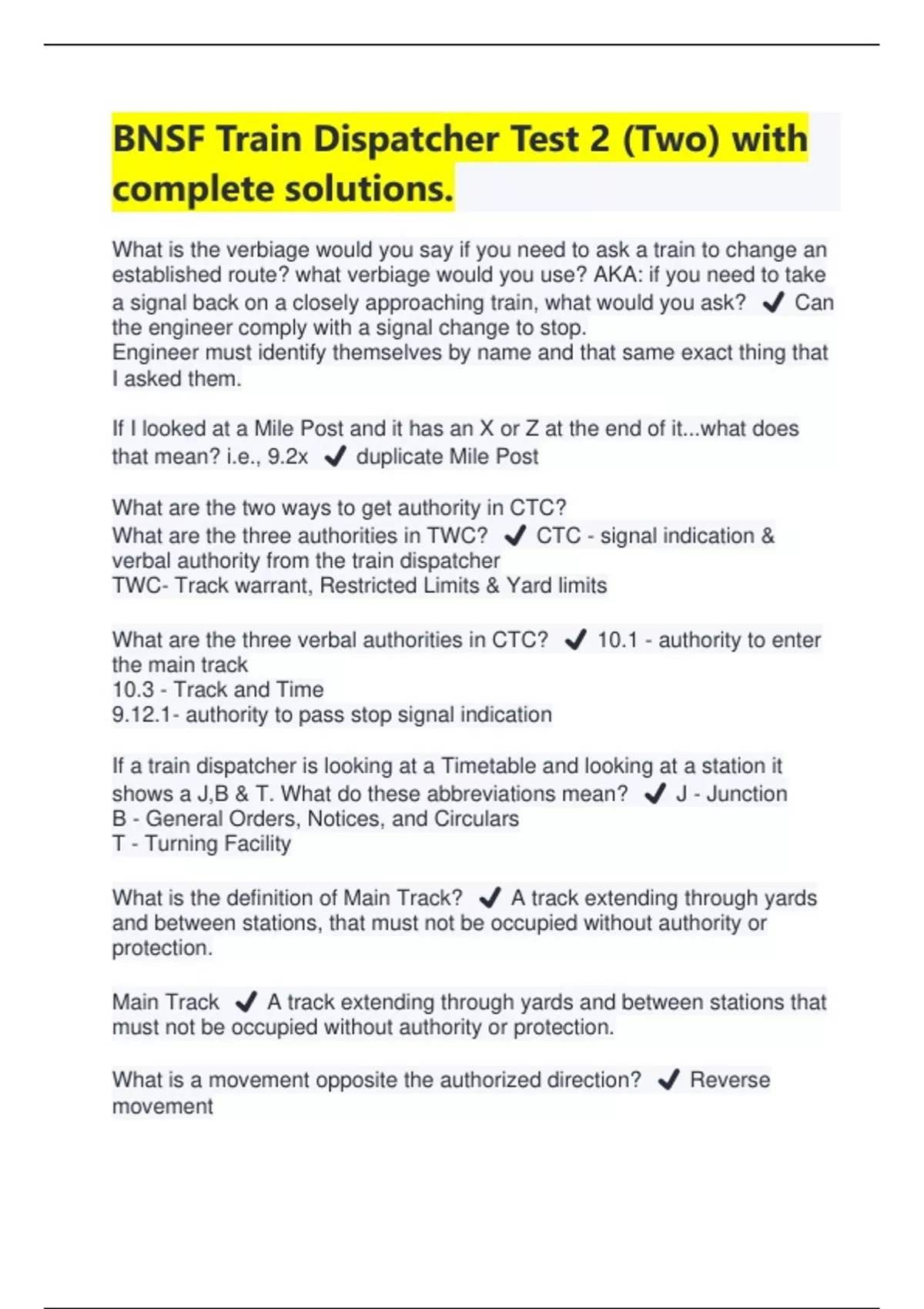 BNSF Train Dispatcher Test 2 (Two) with complete solutions | Latest 2024/2025 What is the verbiage would you say if you need to ask a train to change an established route? what verbiage would you use? AKA: if you need to take a signal back on a closely approaching train, what would you ask? ️ Can the engineer comply with a signal change to stop. Engineer must identify themselves by name and that same exact thing that I asked them. If I looked at a Mile Post and it has an X or Z at the end of it...what does that mean? i.e., 9.2x ️ duplicate Mile Post What are the two ways to get authority in CTC? What are the three authorities in TWC? ️ CTC - signal indication & verbal authority from the train dispatcher TWC- Track warrant, Restricted Limits & Yard limits What are the three verbal authorities in CTC? ️ 10.1 - authority to enter the main track 10.3 - Track and Time 9.12.1- authority to pass stop signal indication If a train dispatcher is looking at a Timetable and looking at a station it shows a J,B & T. What do these abbreviations mean? ️ J - Junction B - General Orders, Notices, and Circulars T - Turning Facility What is the definition of Main Track? ️ A track extending through yards and between stations, that must not be occupied without authority or protection. Main Track ️ A track extending through yards and between stations that must not be occupied without authority or protection. What is a movement oppos