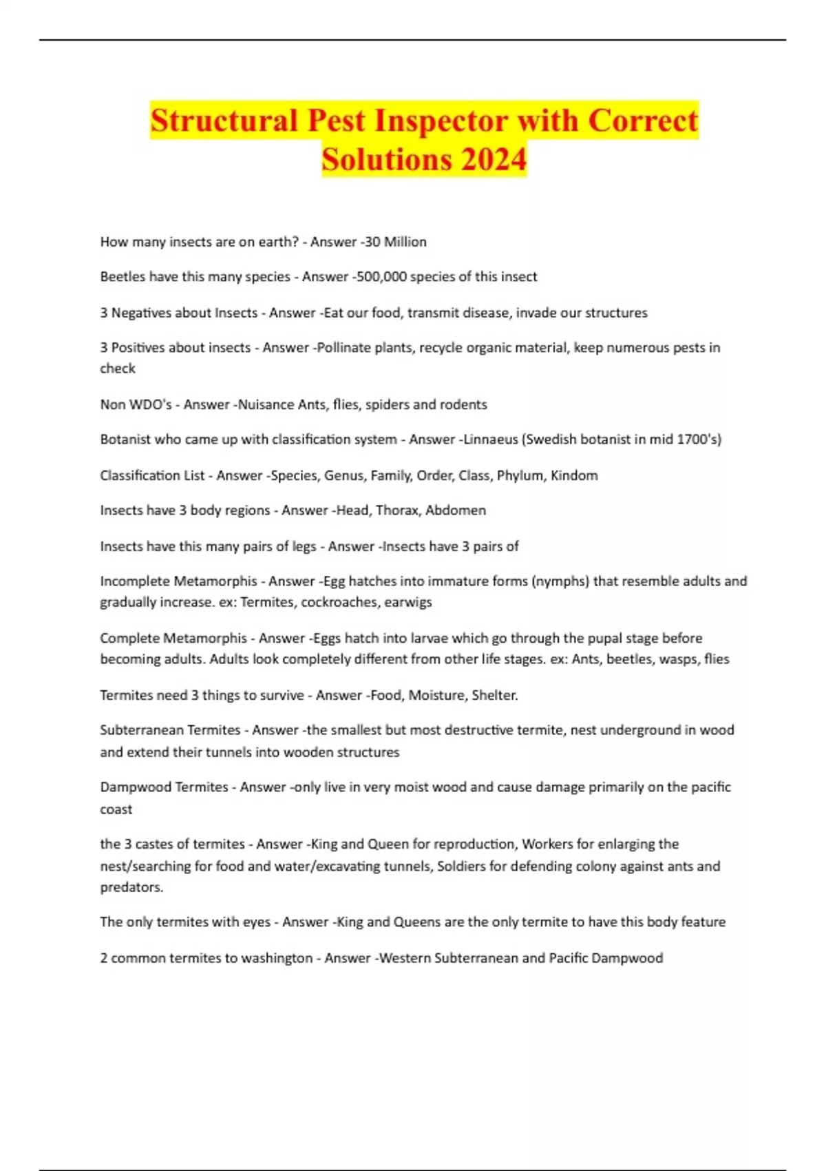 Structural Pest Inspector with Correct Solutions 2024 How many insects are on earth? - Answer -30 Million Beetles have this many species - Answer -500,000 species of this insect 3 Negatives about Insects - Answer -Eat our food, transmit disease, invade our structures 3 Positives about insects - Answer -Pollinate plants, recycle organic material, keep numerous pests in check Non WDO's - Answer -Nuisance Ants, flies, spiders and rodents Botanist who came up with classification system - Answer -Linnaeus (Swedish botanist in mid 1700's) Classification List - Answer -Species, Genus, Family, Order, Class, Phylum, Kindom Insects have 3 body regions - Answer -Head, Thorax, Abdomen Insects have this many pairs of legs - Answer -Insects have 3 pairs of Incomplete Metamorphis - Answer -Egg hatches into immature forms (nymphs) that resemble adults and gradually increase. ex: Termites, cockroaches, earwigs Complete Metamorphis - Answer -Eggs hatch into larvae which go through the pupal stage before becoming adults. Adults look completely different from other life stages. ex: Ants, beetles, wasps, flies Termites need 3 things to survive - Answer -Food, Moisture, Shelter. Subterranean Termites - Answer -the smallest but most destructive termite, nest underground in wood and extend their tunnels into wooden structures Dampwood Termites - Answer -only live in very moist wood and cause damage primarily on the pacific coast the 3 castes of termites - Answer -King and Queen for reproduction, Workers for enlarging the nest/searching for food and water/excavating tunnels, Soldiers for defending colony against ants and predators. The only termites with eyes - Answer -King and Queens are the only termite to have this body feature 2 common termites to washington - Answer -Western Subterranean and Pacific Dampwood