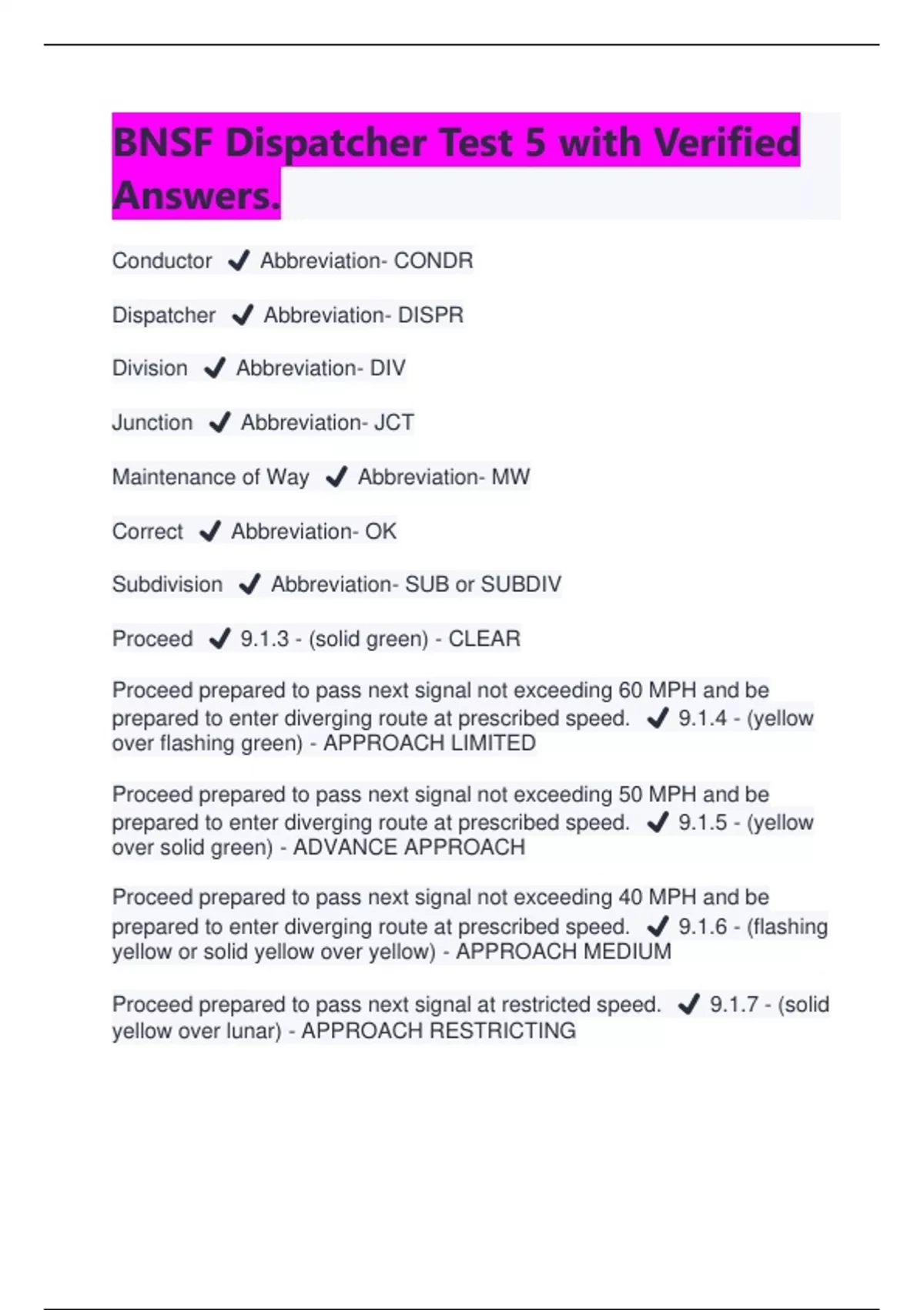 BNSF Dispatcher Test 5 with Verified Answers | Latest 2024/2025 Conductor ️ Abbreviation- CONDR Dispatcher ️ Abbreviation- DISPR Division ️ Abbreviation- DIV Junction ️ Abbreviation- JCT Maintenance of Way ️ Abbreviation- MW Correct ️ Abbreviation- OK Subdivision ️ Abbreviation- SUB or SUBDIV Proceed ️ 9.1.3 - (solid green) - CLEAR Proceed prepared to pass next signal not exceeding 60 MPH and be prepared to enter diverging route at prescribed speed. ️ 9.1.4 - (yellow over flashing green) - APPROACH LIMITED Proceed prepared to pass next signal not exceeding 50 MPH and be prepared to enter diverging route at prescribed speed. ️ 9.1.5 - (yellow over solid green) - ADVANCE APPROACH Proceed prepared to pass next signal not exceeding 40 MPH and be prepared to enter diverging route at prescribed speed. ️ 9.1.6 - (flashing yellow or solid yellow over yellow) - APPROACH MEDIUM Proceed prepared to pass next signal at restricted speed. ️ 9.1.7 - (solid yellow over lunar) - APPROACH RESTRICTING