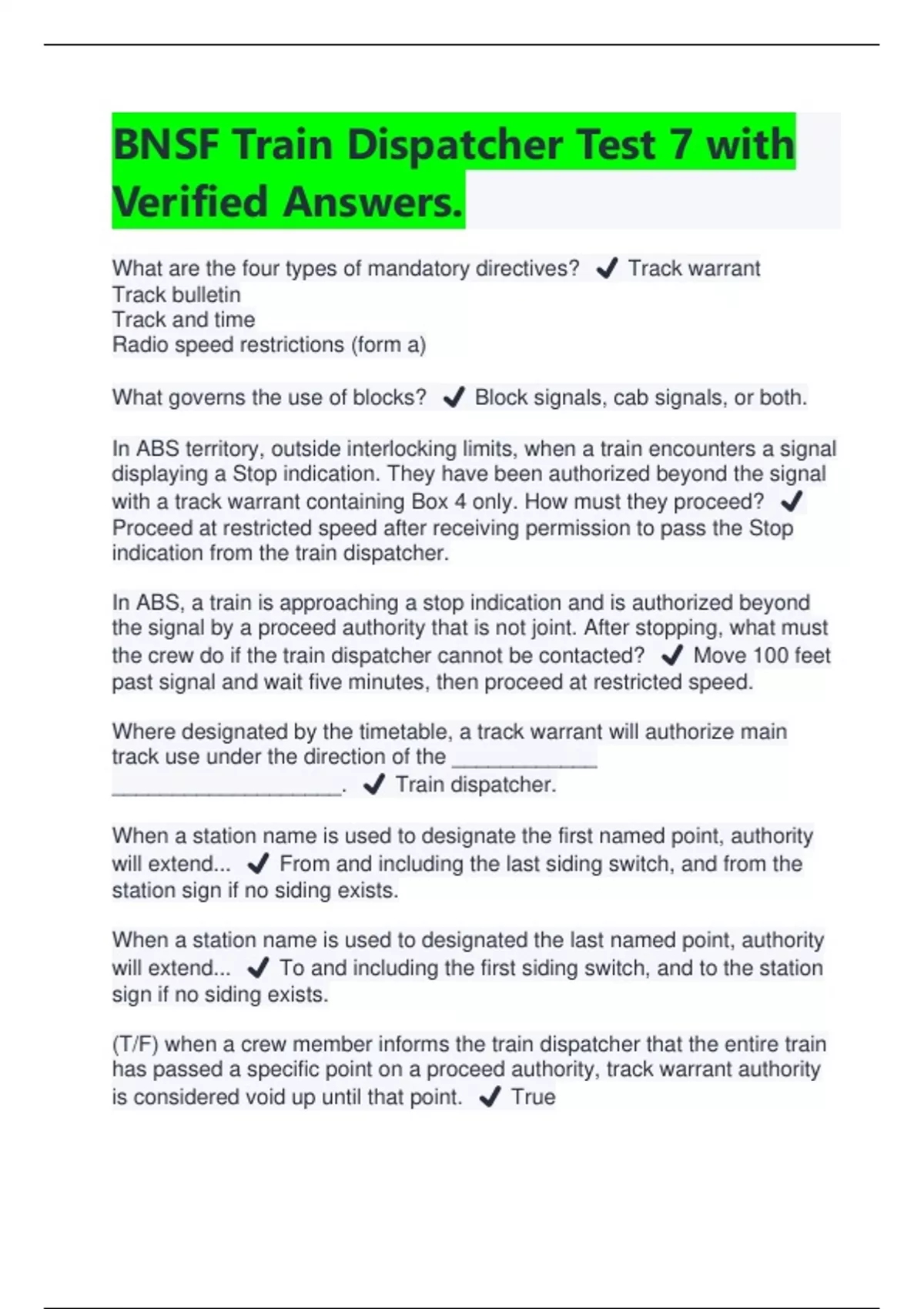 BNSF Train Dispatcher Test 7 with Verified Answers | Latest 2024/2025 What are the four types of mandatory directives? ️ Track warrant Track bulletin Track and time Radio speed restrictions (form a) What governs the use of blocks? ️ Block signals, cab signals, or both. In ABS territory, outside interlocking limits, when a train encounters a signal displaying a Stop indication. They have been authorized beyond the signal with a track warrant containing Box 4 only. How must they proceed? ️ Proceed at restricted speed after receiving permission to pass the Stop indication from the train dispatcher. In ABS, a train is approaching a stop indication and is authorized beyond the signal by a proceed authority that is not joint. After stopping, what must the crew do if the train dispatcher cannot be contacted? ️ Move 100 feet past signal and wait five minutes, then proceed at restricted speed. Where designated by the timetable, a track warrant will authorize main track use under the direction of the ____________ ___________________. ️ Train dispatcher. When a station name is used to designate the first named point, authority will extend... ️ From and including the last siding switch, and from the station sign if no siding exists. When a station name is used to designated the last named point, authority will extend... ️ To and including the first siding switch, and to the station sign if no siding exists. (T/F) when a crew member informs the train dispatcher that the entire train has passed a specific point on a proceed authority,