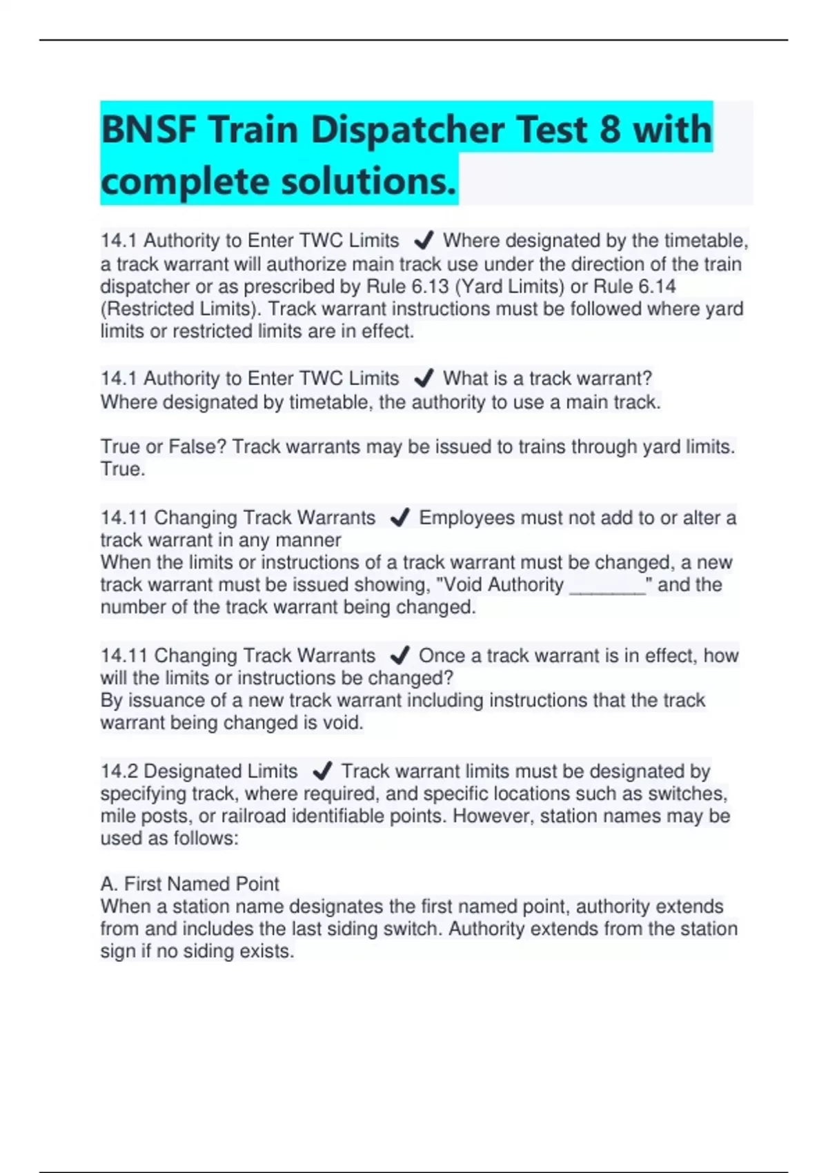 BNSF Train Dispatcher Test 8 with complete solutions | Latest 2024/2025 14.1 Authority to Enter TWC Limits ️ Where designated by the timetable, a track warrant will authorize main track use under the direction of the train dispatcher or as prescribed by Rule 6.13 (Yard Limits) or Rule 6.14 (Restricted Limits). Track warrant instructions must be followed where yard limits or restricted limits are in effect. 14.1 Authority to Enter TWC Limits ️ What is a track warrant? Where designated by timetable, the authority to use a main track. True or False? Track warrants may be issued to trains through yard limits. True. 14.11 Changing Track Warrants ️ Employees must not add to or alter a track warrant in any manner When the limits or instructions of a track warrant must be changed, a new track warrant must be issued showing, "Void Authority _______" and the number of the track warrant being changed. 14.11 Changing Track Warrants ️ Once a track warrant is in effect, how will the limits or instructions be changed? By issuance of a new track warrant including instructions that the track warrant being changed is void. 14.2 Designated Limits ️ Track warrant limits must be designated by specifying track, where required, and specific locations such as switches, mile posts, or railroad identifiable points. However, station names may be used as follows: A. First Named Point When a station name designates the first named point, authority extends from and includes the last siding switch. Authority extends from the station sign if no siding exists.
