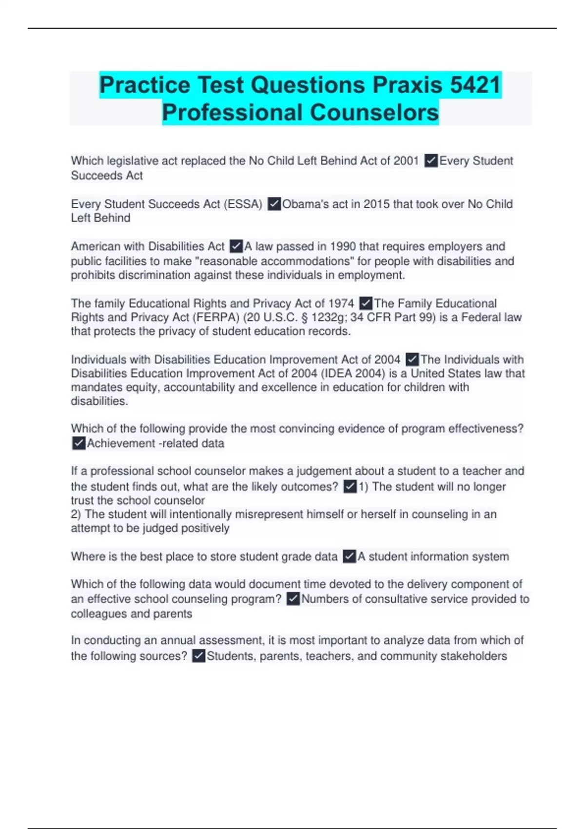 Which legislative act replaced the No Child Left Behind Act of 2001 Every Student Succeeds Act Every Student Succeeds Act (ESSA) Obama's act in 2015 that took over No Child Left Behind American with Disabilities Act A law passed in 1990 that requires employers and public facilities to make "reasonable accommodations" for people with disabilities and prohibits discrimination against these individuals in employment. The family Educational Rights and Privacy Act of 1974 The Family Educational Rights and Privacy Act (FERPA) (20 U.S.C. § 1232g; 34 CFR Part 99) is a Federal law that protects the privacy of student education records. Individuals with Disabilities Education Improvement Act of 2004 The Individuals with Disabilities Education Improvement Act of 2004 (IDEA 2004) is a United States law that mandates equity, accountability and excellence in education for children with disabilities. Which of the following provide the most convincing evidence of program effectiveness? Achievement -related data If a professional school counselor makes a judgement about a student to a teacher and the student finds out, what are the likely outcomes? 1) The student will no longer trust the school counselor 2) The student will intentionally misrepresent himself or herself in counseling in an attempt to be judged positively Where is the best place to store student grade data A student information system Which of the following data would document time devoted to the delivery component of an effective school counseling program? Numbers of consultative service provided to colleagues and parents