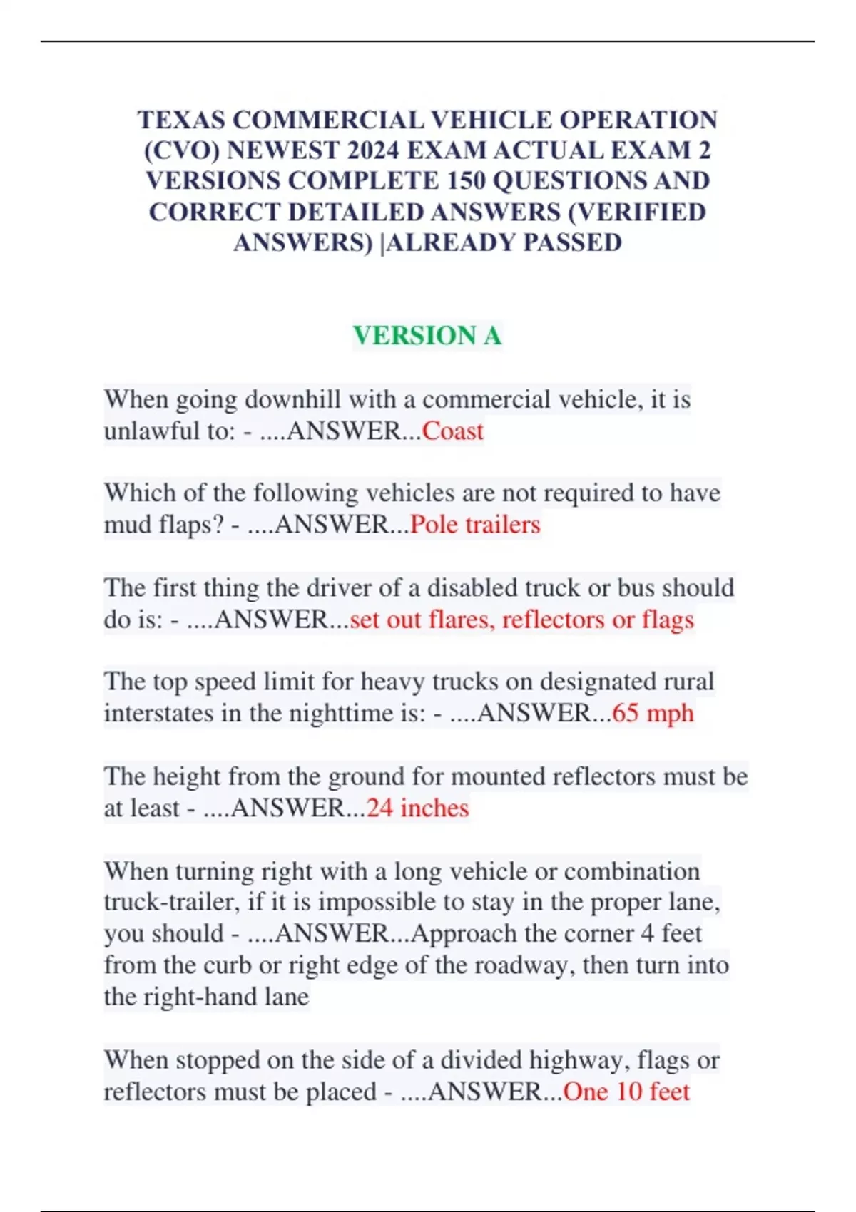 TEXAS COMMERCIAL VEHICLE OPERATION (CVO) NEWEST 2024 EXAM ACTUAL EXAM 2 VERSIONS COMPLETE 150 QUESTIONS AND CORRECT DETAILED ANSWERS (VERIFIED ANSWERS) |ALREADY PASSED