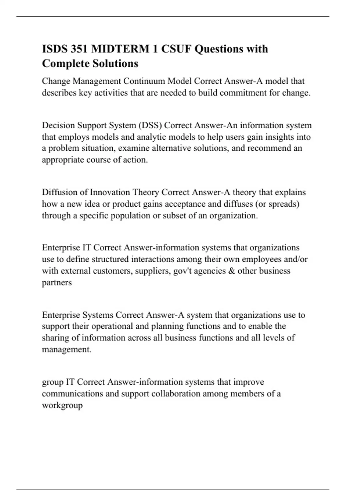 ISDS 351 MIDTERM 1 CSUF Questions with Complete Solutions