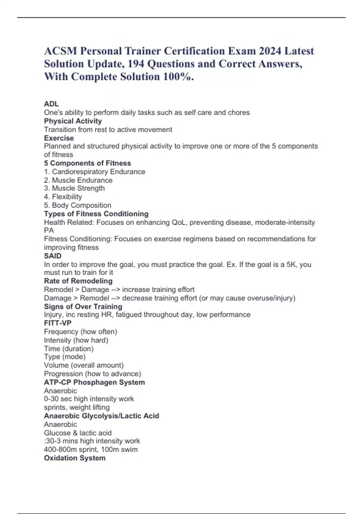 ACSM Personal Trainer Certification Exam 2024 Latest Solution Update, 194 Questions and Correct Answers, With Complete Solution 100%. ADL One's ability to perform daily tasks such as self care and chores Physical Activity Transition from rest to active movement Exercise Planned and structured physical activity to improve one or more of the 5 components of fitness 5 Components of Fitness 1. Cardiorespiratory Endurance 2. Muscle Endurance 3. Muscle Strength 4. Flexibility 5. Body Composition Types of Fitness Conditioning Health Related: Focuses on enhancing QoL, preventing disease, moderate-intensity PA Fitness Conditioning: Focuses on exercise regimens based on recommendations for improving fitness SAID In order to improve the goal, you must practice the goal. Ex. If the goal is a 5K, you must run to train for it Rate of Remodeling Remodel > Damage --> increase training effort Damage > Remodel --> decrease training effort (or may cause overuse/injury) Signs of Over Training Injury, inc resting HR, fatigued throughout day, low performance FITT-VP Frequency (how often) Intensity (how hard) Time (duration) Type (mode) Volume (overall amount) Progression (how to advance) ATP-CP Phosphagen System Anaerobic 0-30 sec high intensity work sprints, weight lifting Anaerobic Glycolysis/Lactic Acid Anaerobic Glucose & lactic acid :30-3 mins high intensity work 400-800m sprint, 100m swim Oxidation System