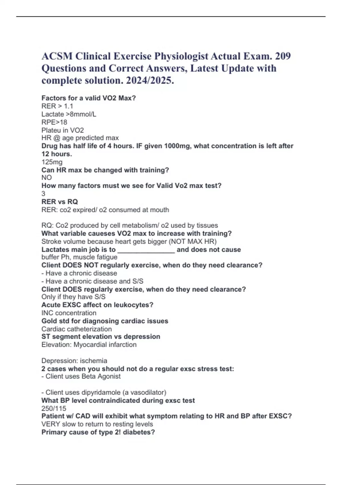ACSM Clinical Exercise Physiologist Actual Exam. 209 Questions and Correct Answers, Latest Update with complete solution. 2024/2025. Factors for a valid VO2 Max? RER > 1.1 Lactate >8mmol/L RPE>18 Plateu in VO2 HR @ age predicted max Drug has half life of 4 hours. IF given 1000mg, what concentration is left after 12 hours. 125mg Can HR max be changed with training? NO How many factors must we see for Valid Vo2 max test? 3 RER vs RQ RER: co2 expired/ o2 consumed at mouth RQ: Co2 produced by cell metabolism/ o2 used by tissues What variable caueses VO2 max to increase with training? Stroke volume because heart gets bigger (NOT MAX HR) Lactates main job is to _______________ and does not cause buffer Ph, muscle fatigue Client DOES NOT regularly exercise, when do they need clearance? - Have a chronic disease - Have a chronic disease and S/S Client DOES regularly exercise, when do they need clearance? Only if they have S/S Acute EXSC affect on leukocytes? INC concentration Gold std for diagnosing cardiac issues Cardiac catheterization ST segment elevation vs depression Elevation: Myocardial infarction Depression: ischemia 2 cases when you should not do a regular exsc stress test: - Client uses Beta Agonist - Client uses dipyridamole (a vasodilator) What BP level contraindicated during exsc test 250/115 Patient w/ CAD will exhibit what symptom relating to HR and BP after EXSC? VERY slow to return to resting levels Primary cause of type 2! diabetes? Inflammation