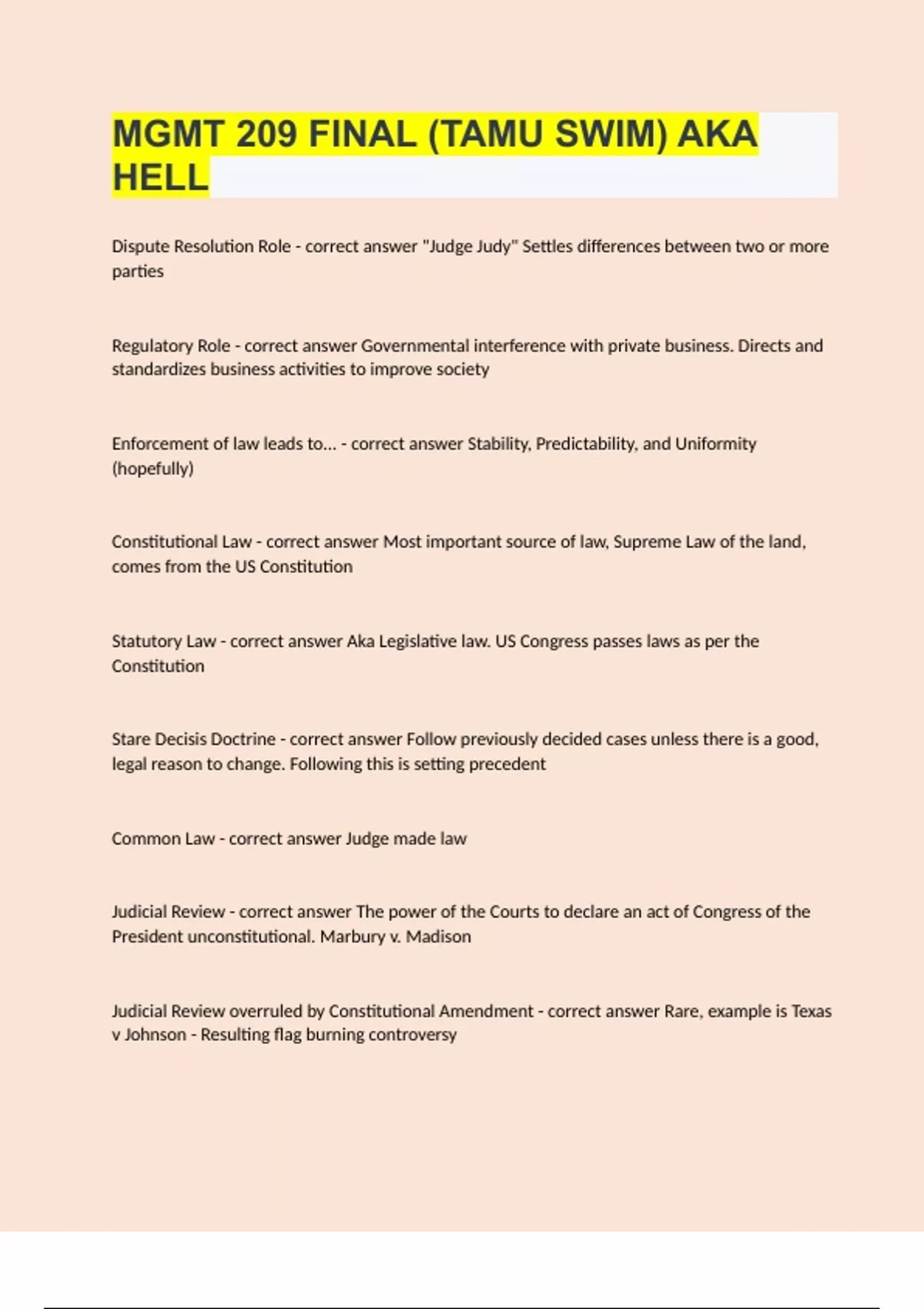 TAMU MGMT 209 STUDY GUIDE MULTIPLE CHOICE Chapter 1 Introduction to Law and Sources of Law You get angry at your roommate and decide to kill him/her. If you do, what type of law have you violated? A) Statutory B) State C) Criminal D) Public E) All of the above E) All of the above There are two major functions of the legal system. When you are sued in Court this is an example of what type of major function of the legal system?