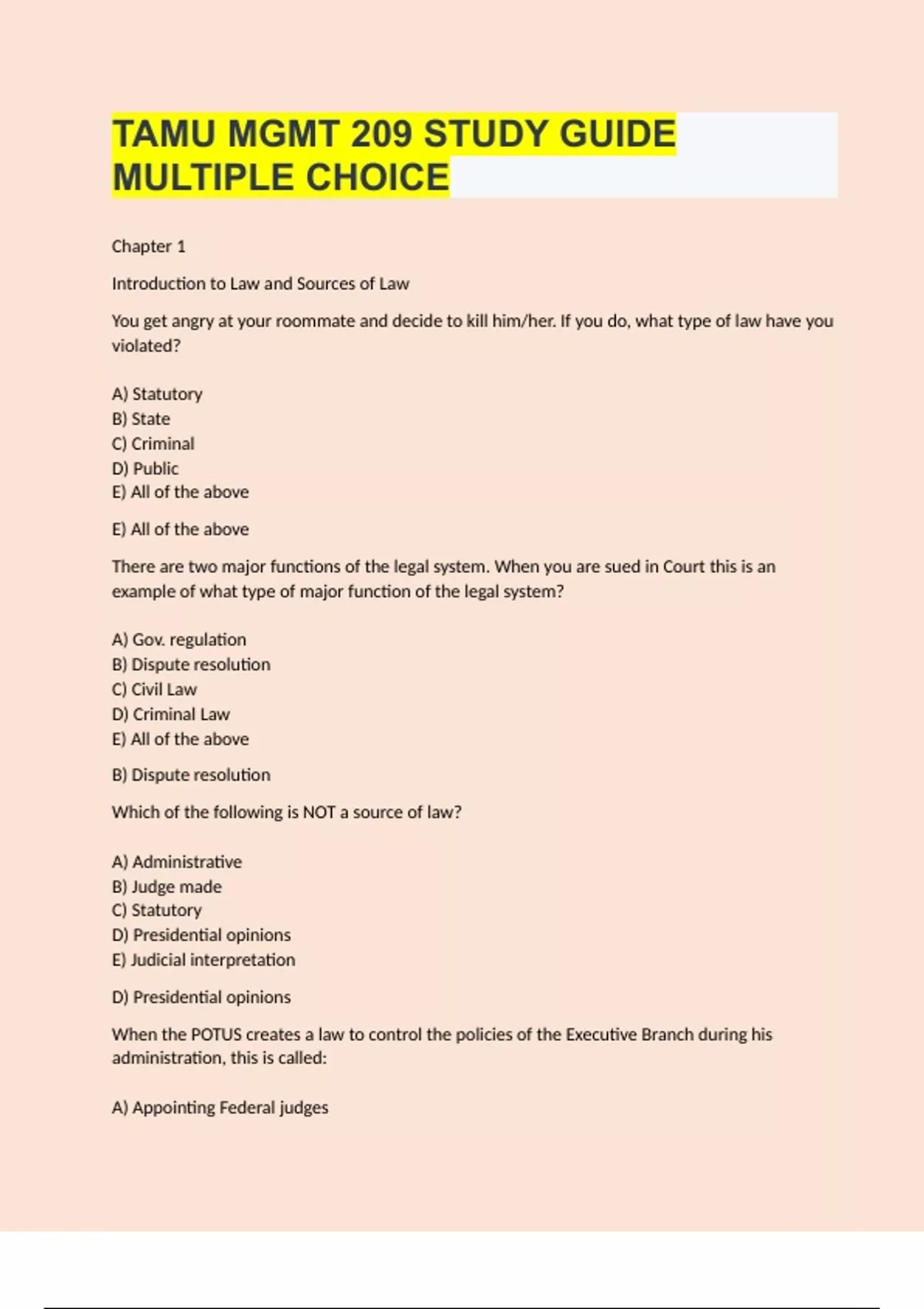 TAMU MGMT 209 STUDY GUIDE MULTIPLE CHOICE Chapter 1 Introduction to Law and Sources of Law You get angry at your roommate and decide to kill him/her. If you do, what type of law have you violated? A) Statutory B) State C) Criminal D) Public E) All of the above E) All of the above There are two major functions of the legal system. When you are sued in Court this is an example of what type of major function of the legal system?