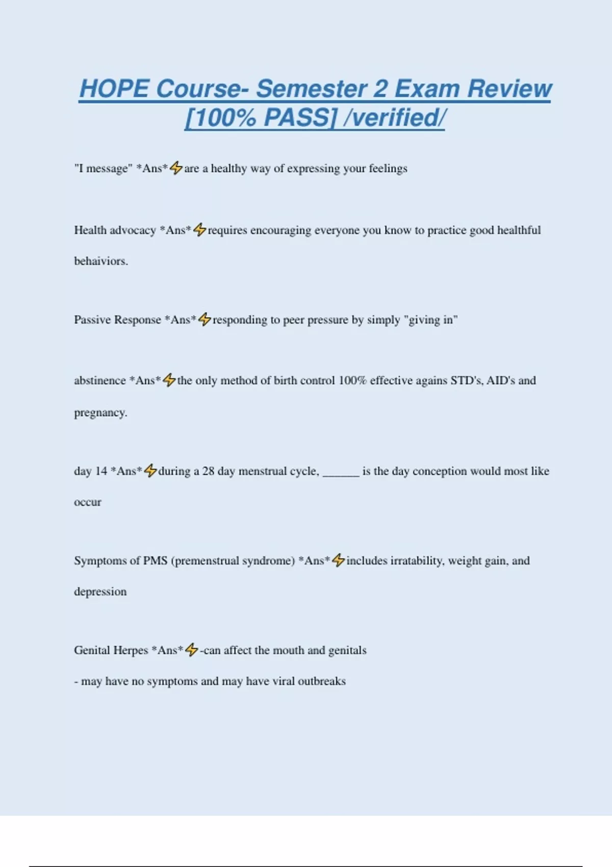 HOPE Course- Semester 2 Exam Review [100% PASS] /verified/