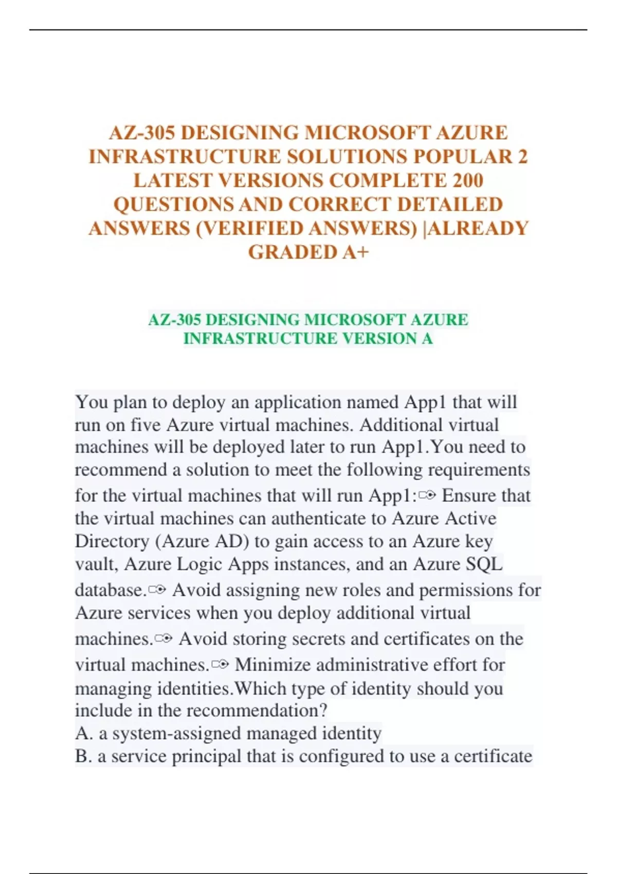 AZ-305 DESIGNING MICROSOFT AZURE INFRASTRUCTURE SOLUTIONS POPULAR 2 LATEST VERSIONS COMPLETE 200 QUESTIONS AND CORRECT DETAILED ANSWERS (VERIFIED ANSWERS) |ALREADY GRADED A+