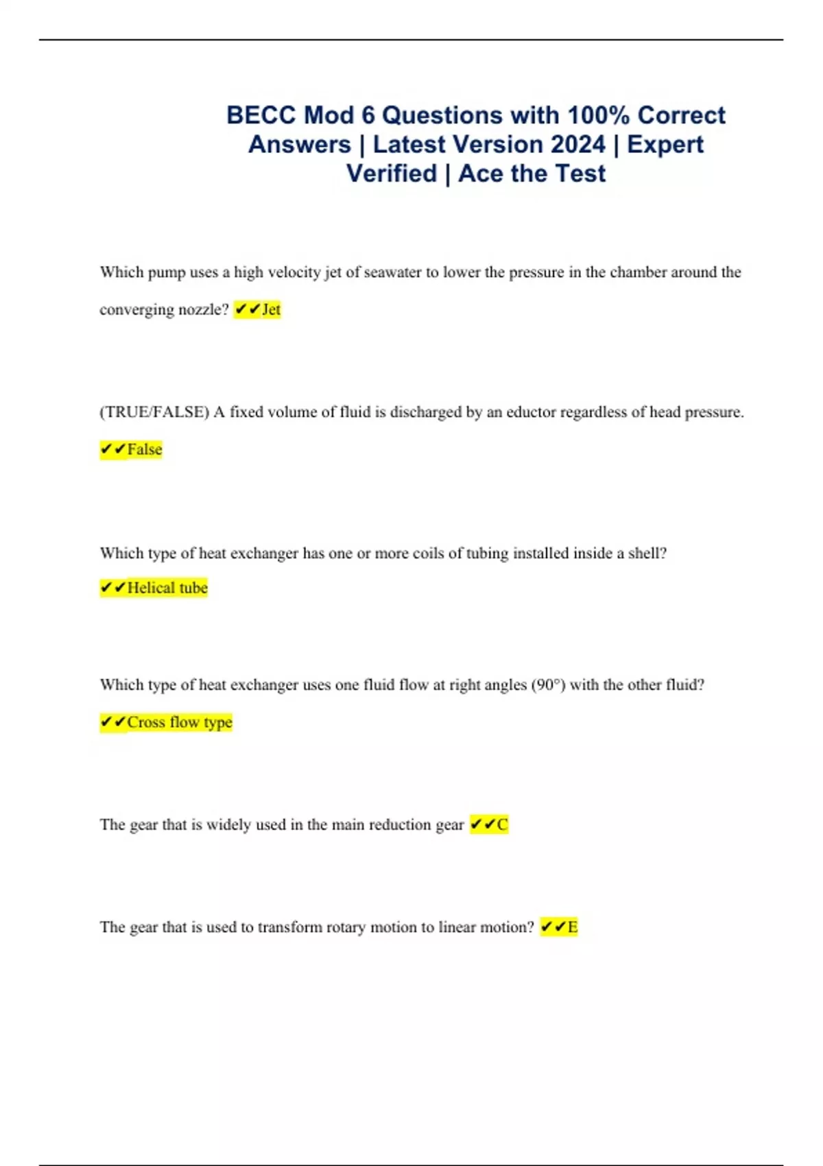 Which pump uses a high velocity jet of seawater to lower the pressure in the chamber around the converging nozzle? Jet (TRUE/FALSE) A fixed volume of fluid is discharged by an eductor regardless of head pressure. False Which type of heat exchanger has one or more coils of tubing installed inside a shell? Helical tube Which type of heat exchanger uses one fluid flow at right angles (90°) with the other fluid? Cross flow type The gear that is widely used in the main reduction gear C The gear that is used to transform rotary motion to linear motion? E