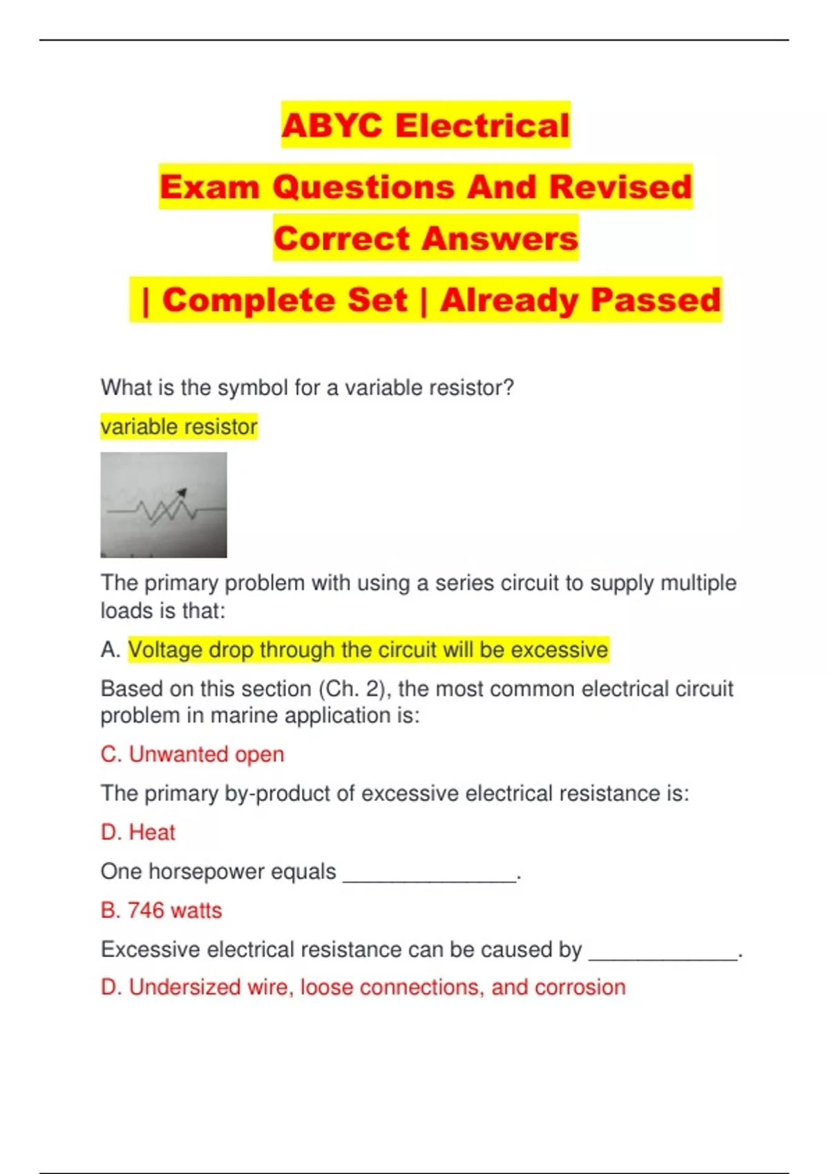 ABYC Electrical Exam Questions And Revised Correct Answers | Complete Set | Already Passed What is the symbol for a variable resistor? variable resistor The primary problem with using a series circuit to supply multiple loads is that: A. Voltage drop through the circuit will be excessive Based on this section (Ch. 2), the most common electrical circuit problem in marine application is: C. Unwanted open The primary by-product of excessive electrical resistance is: D. Heat One horsepower equals ______________. B. 746 watts Excessive electrical resistance can be caused by ____________. D. Undersized wire, loose connections, and corrosion _________ through circuits on a boat is perhaps the most common problem with electrical circuitry. D. Resistance to electrical current flow