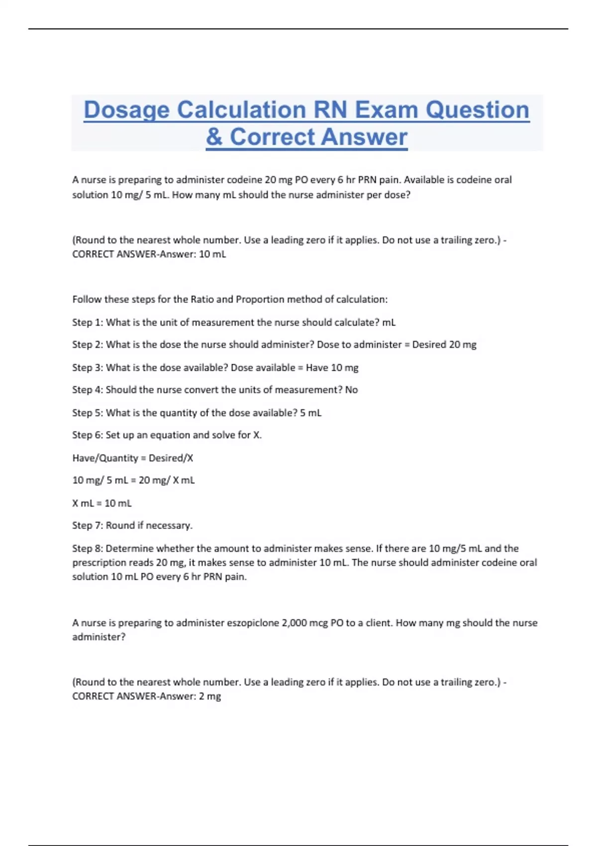 Dosage Calculation RN Exam Question & Correct Answer A nurse is preparing to administer codeine 20 mg PO every 6 hr PRN pain. Available is codeine oral solution 10 mg/ 5 mL. How many mL should the nurse administer per dose? (Round to the nearest whole number. Use a leading zero if it applies. Do not use a trailing zero.) - CORRECT ANSWER-Answer: 10 mL