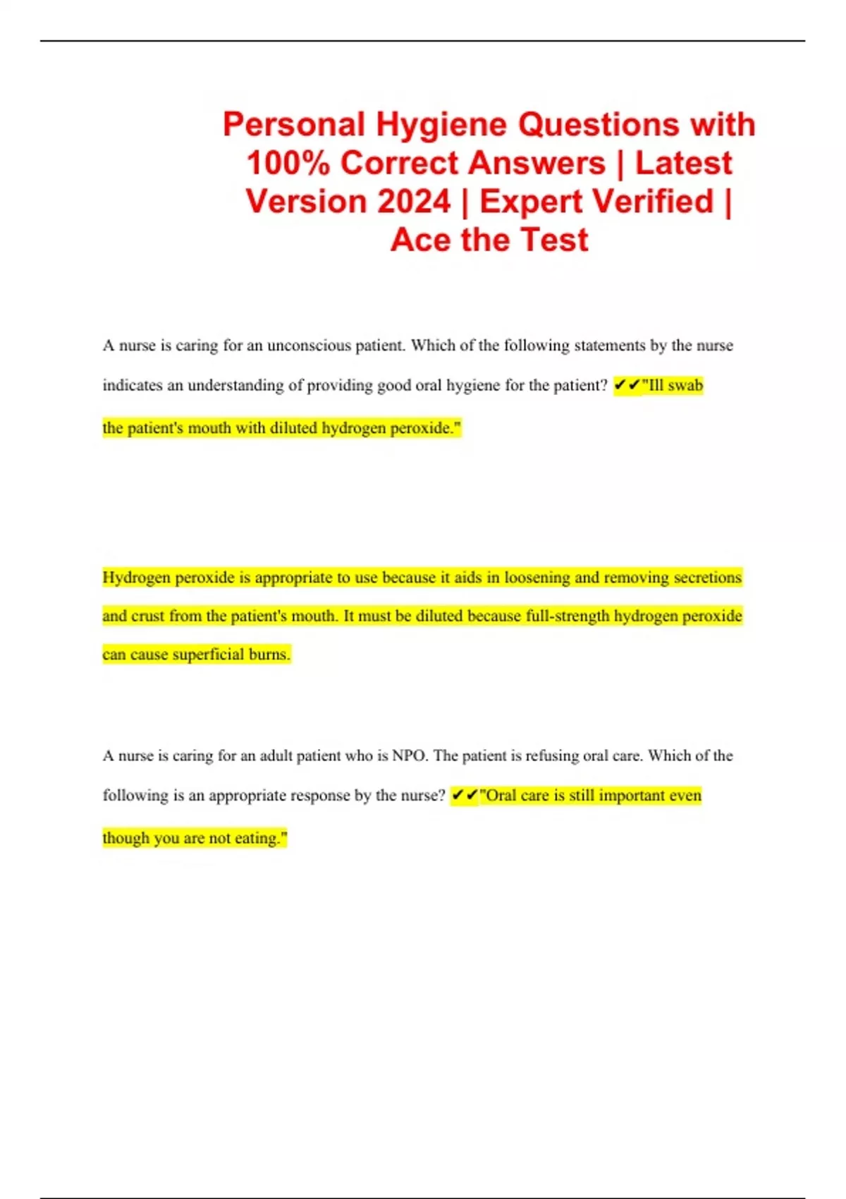 Personal Hygiene Questions with 100% Correct Answers | Latest Version 2024 | Expert Verified | Ace the Test