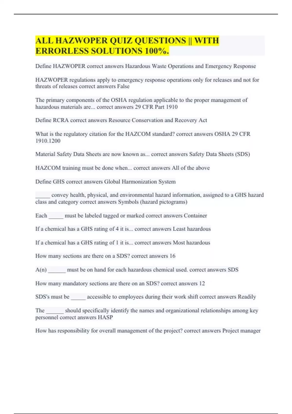 ALL HAZWOPER QUIZ QUESTIONS || WITH ERRORLESS SOLUTIONS 100%.