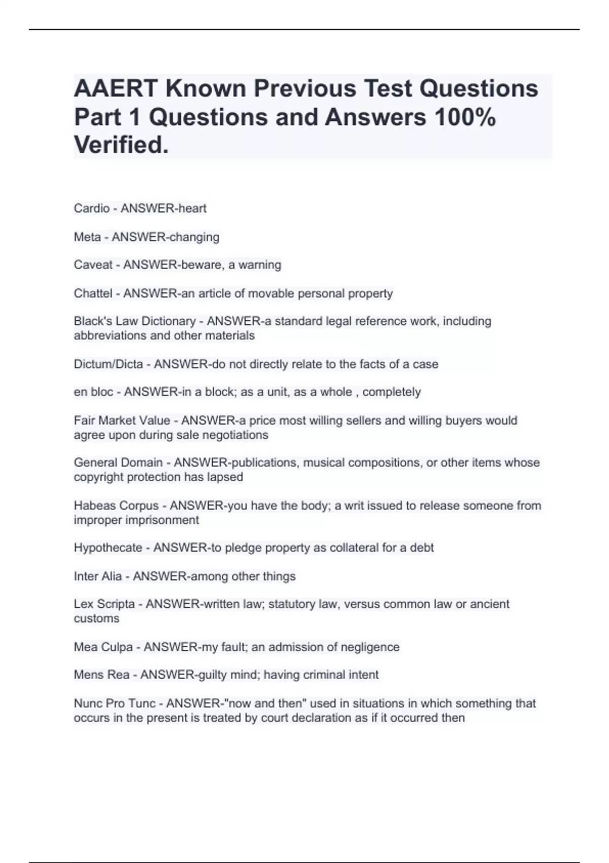 Cardio - ANSWER-heart Meta - ANSWER-changing Caveat - ANSWER-beware, a warning Chattel - ANSWER-an article of movable personal property Black's Law Dictionary - ANSWER-a standard legal reference work, including abbreviations and other materials Dictum/Dicta - ANSWER-do not directly relate to the facts of a case en bloc - ANSWER-in a block; as a unit, as a whole , completely Fair Market Value - ANSWER-a price most willing sellers and willing buyers would agree upon during sale negotiations General Domain - ANSWER-publications, musical compositions, or other items whose copyright protection has lapsed Habeas Corpus - ANSWER-you have the body; a writ issued to release someone from improper imprisonment Hypothecate - ANSWER-to pledge property as collateral for a debt Inter Alia - ANSWER-among other things Lex Scripta - ANSWER-written law; statutory law, versus common law or ancient customs Mea Culpa - ANSWER-my fault; an admission of negligence Mens Rea - ANSWER-guilty mind; having criminal intent Nunc Pro Tunc - ANSWER-"now and then" used in situations in which something that occurs in the present is treated by court declaration as if it occurred then Official Record - ANSWER-The transcript of court proceedings, exhibits, and all physical evidence Res Ipsa Loquitur - ANSWER-the thing speaks for itself Res Judicata - ANSWER-decided thing; matter acted upon or decided finally, a conclus