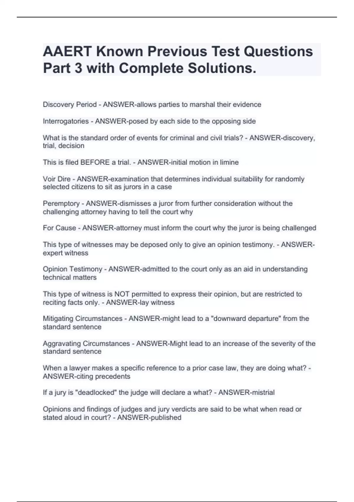 Discovery Period - ANSWER-allows parties to marshal their evidence Interrogatories - ANSWER-posed by each side to the opposing side What is the standard order of events for criminal and civil trials? - ANSWER-discovery, trial, decision This is filed BEFORE a trial. - ANSWER-initial motion in limine Voir Dire - ANSWER-examination that determines individual suitability for randomly selected citizens to sit as jurors in a case Peremptory - ANSWER-dismisses a juror from further consideration without the challenging attorney having to tell the court why For Cause - ANSWER-attorney must inform the court why the juror is being challenged This type of witnesses may be deposed only to give an opinion testimony. - ANSWER-expert witness Opinion Testimony - ANSWER-admitted to the court only as an aid in understanding technical matters This type of witness is NOT permitted to express their opinion, but are restricted to reciting facts only. - ANSWER-lay witness Mitigating Circumstances - ANSWER-might lead to a "downward departure" from the standard sentence Aggravating Circumstances - ANSWER-Might lead to an increase of the severity of the standard sentence When a lawyer makes a specific reference to a prior case law, they are doing what? - ANSWER-citing precedents If a jury is "deadlocked" the judge will declare a what? - ANSWER-mistrial Opinions and findings of judges and jury verdicts are said to be what when read or stated aloud in court? - ANSWER-published