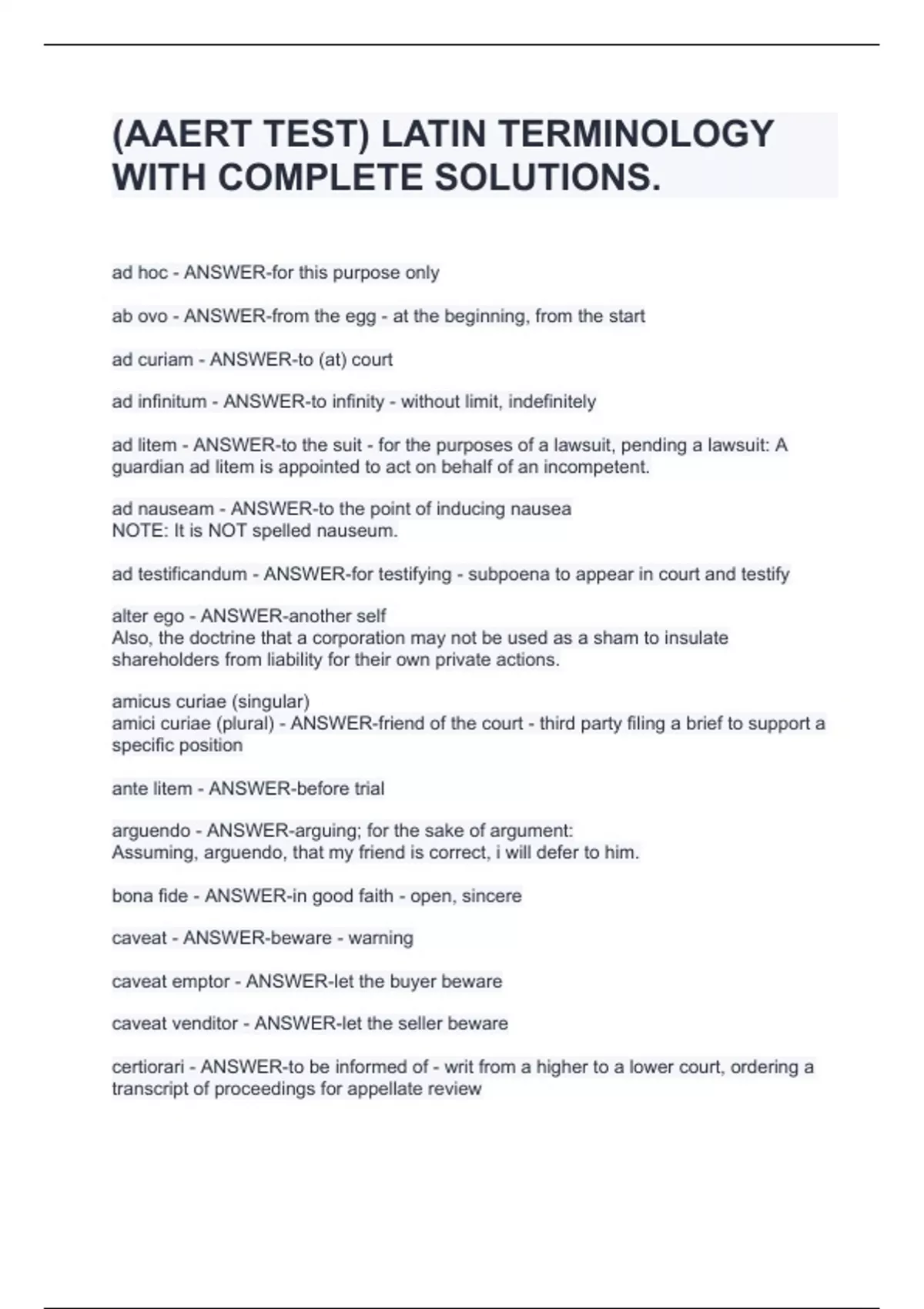 (AAERT TEST) LATIN TERMINOLOGY WITH COMPLETE SOLUTIONS.