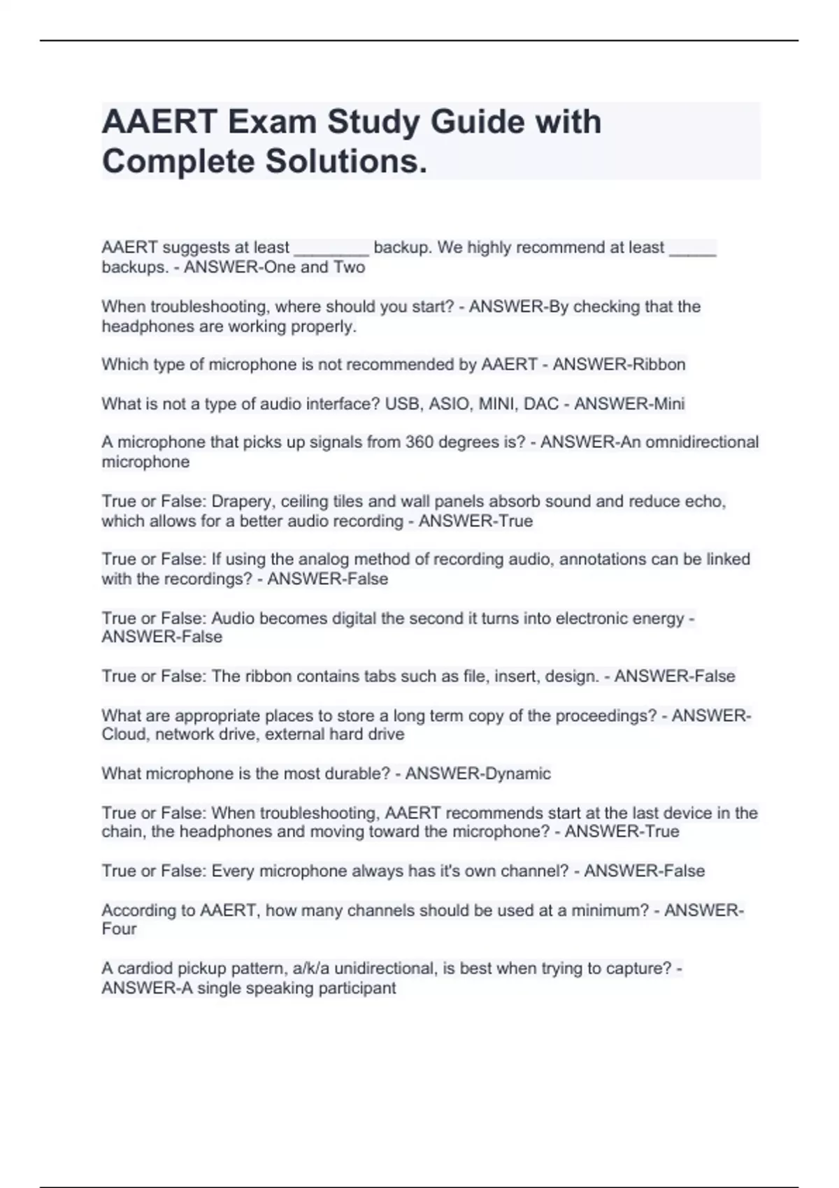 AAERT suggests at least ________ backup. We highly recommend at least _____ backups. - ANSWER-One and Two When troubleshooting, where should you start? - ANSWER-By checking that the headphones are working properly. Which type of microphone is not recommended by AAERT - ANSWER-Ribbon What is not a type of audio interface? USB, ASIO, MINI, DAC - ANSWER-Mini A microphone that picks up signals from 360 degrees is? - ANSWER-An omnidirectional microphone True or False: Drapery, ceiling tiles and wall panels absorb sound and reduce echo, which allows for a better audio recording - ANSWER-True True or False: If using the analog method of recording audio, annotations can be linked with the recordings? - ANSWER-False True or False: Audio becomes digital the second it turns into electronic energy - ANSWER-False True or False: The ribbon contains tabs such as file, insert, design. - ANSWER-False What are appropriate places to store a long term copy of the proceedings? - ANSWER-Cloud, network drive, external hard drive What microphone is the most durable? - ANSWER-Dynamic True or False: When troubleshooting, AAERT recommends start at the last device in the chain, the headphones and moving toward the microphone? - ANSWER-True True or False: Every microphone always has it's own channel? - ANSWER-False According to AAERT, how many channels should be used at a minimum? - ANSWER-Four A cardiod pickup pattern, a/k/a unidirectional, is best when trying to capture? - ANSWER-A single speaking participant What is the purpose of compressing audio files? - ANSWER-To make large audio files small